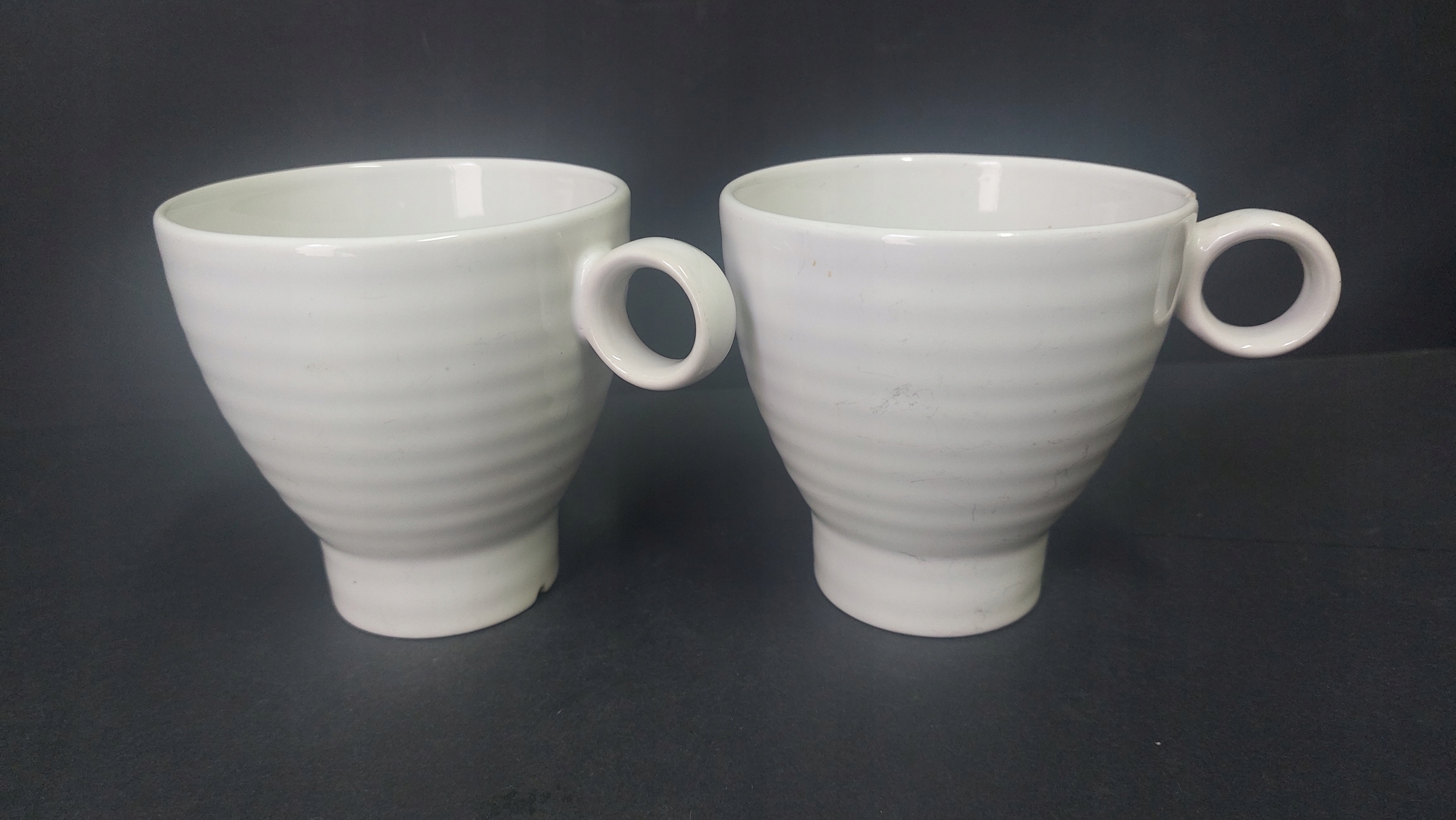 Тема аукціону - це пара керамічних кружок з цікавою формою та ручкою. >