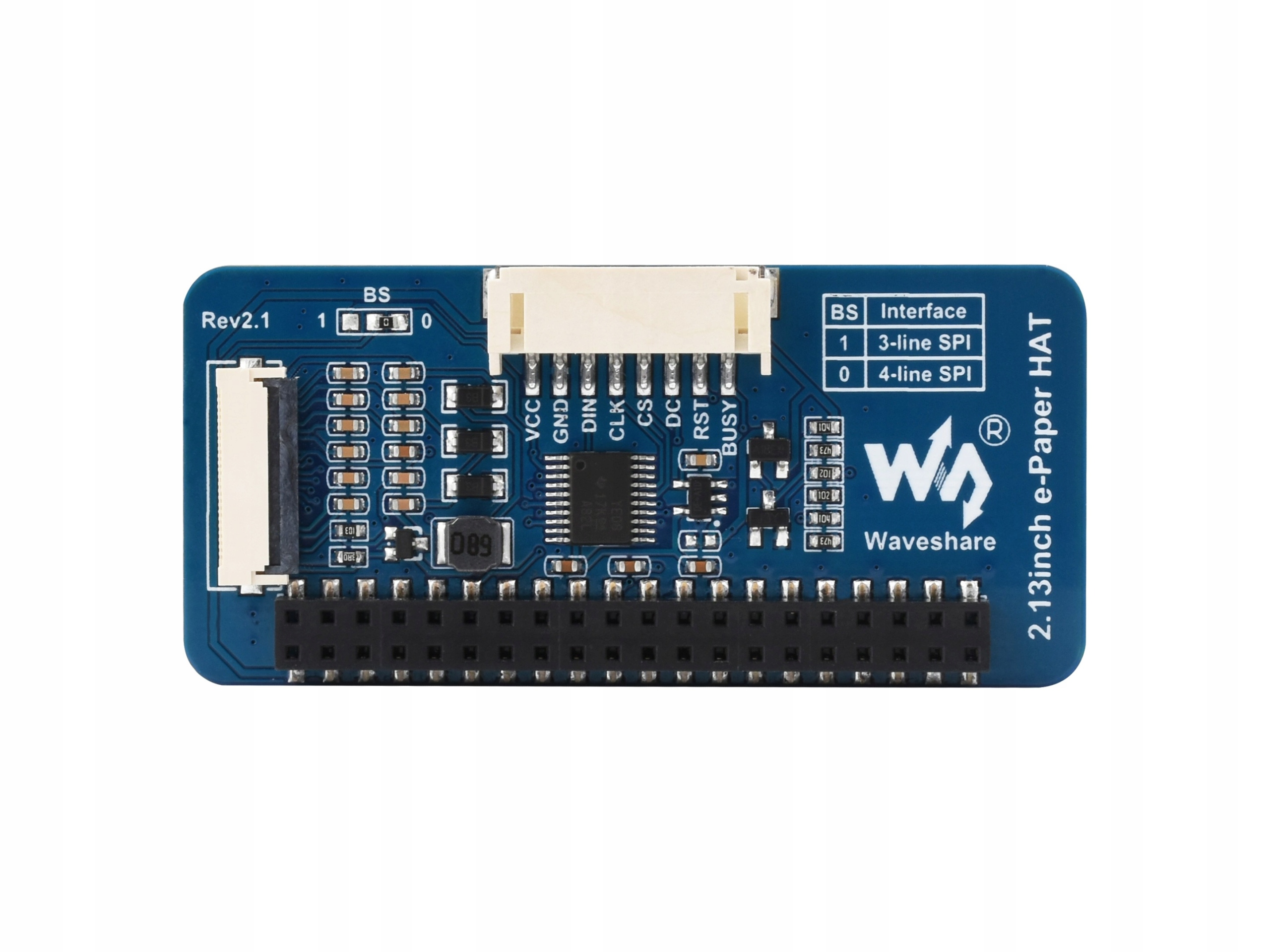 Модуль з діагональним дисплеєм e-Paper 2.13 " та роздільною здатністю 250x122 px. Він має можливість відображати вміст із дворівневою градацією сірого в чотирьох кольорах: червоному, жовтому, чорному та білому. Вбудований контролер спілкується через інтерфейс SPI. Дисплеї цього типу характеризуються високою контрастністю виведеного зображення і споживають електроенергію тільки при зміні відображуваного контенту. Модуль сумісний з системами 3,3 В і 5 В. Має вбудований 40-контактний роз'єм. Веб-сайт Wiki надає підтримку у вигляді прикладів використання з Raspberry Pi, Jetson Nano, Arduino, STM32.