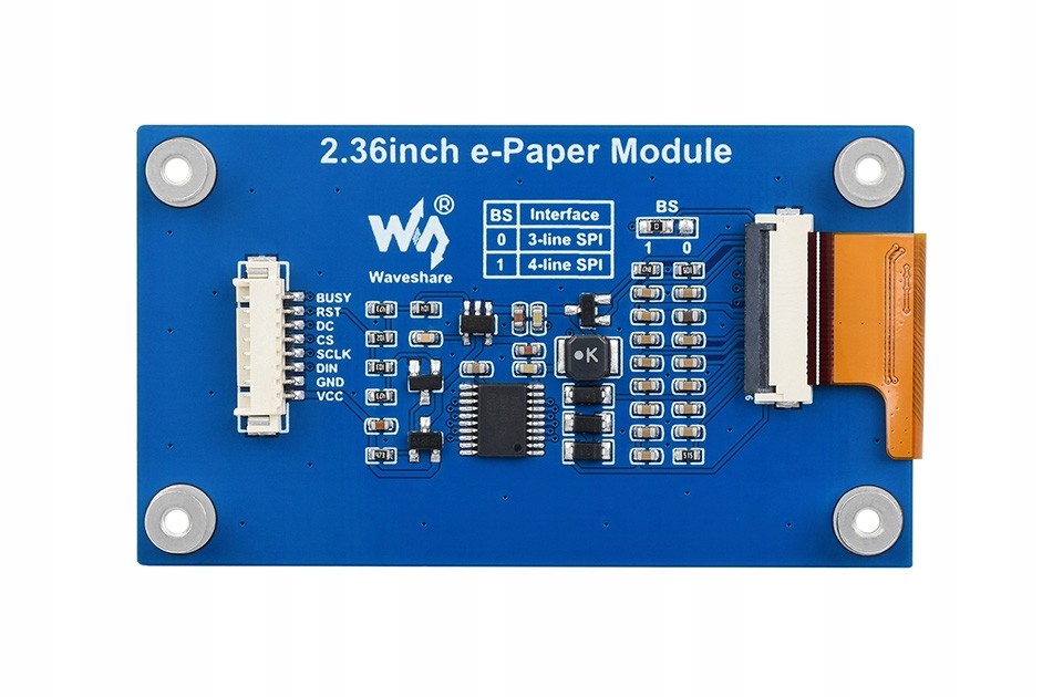з 4-кольоровим (червоним, жовтим, чорним та білим) дисплеєм електронного паперу з діагональним 2,36" та вирішенням 296x168 Pixels. Він має можливість відображення вмісту з дворівневою сірою шкалою, а вбудований контролер спілкується через інтерфейс SPI. Пропонує широкий кут перегляду. Електронні дисплеї характеризуються високим контрастом відображення зображення та споживають електроенергію лише тоді, коли відображений вміст змінюється. Він сумісний із системами 3,3 В і 5 В. On the product page, support is available in the form of examples of use with Raspberry Pi, Jetson Nano, Arduino and STM32.