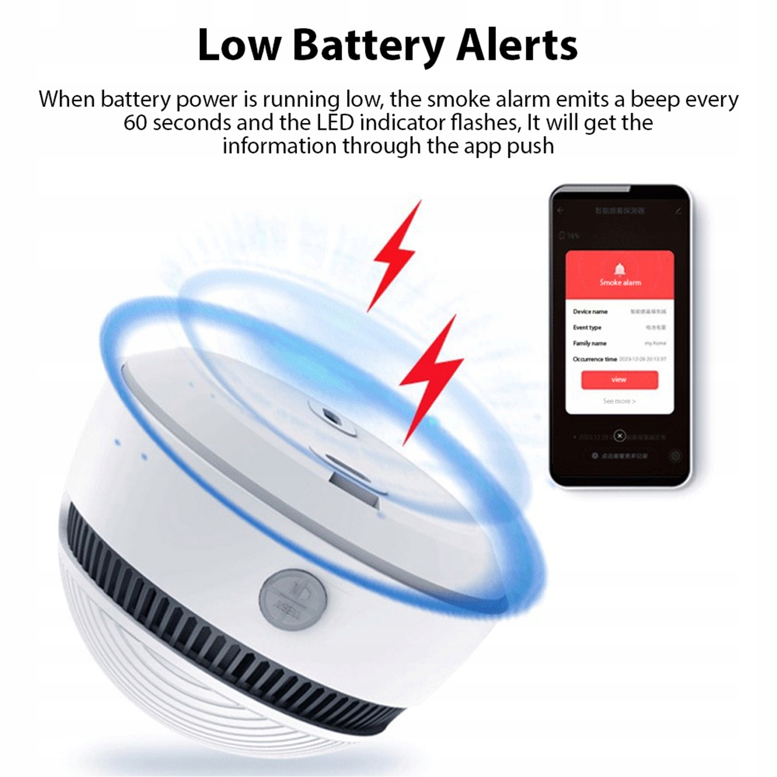 4. Сповіщення про низький заряд батареї: будьте в курсі подій за допомогою функції нагадування про низький заряд батареї нашого розумного детектора. Коли заряд батареї низький, димова сигналізація подає звуковий сигнал кожні 60 секунд, а світлодіодний індикатор блимає, щоб ви ніколи не були здивовані.