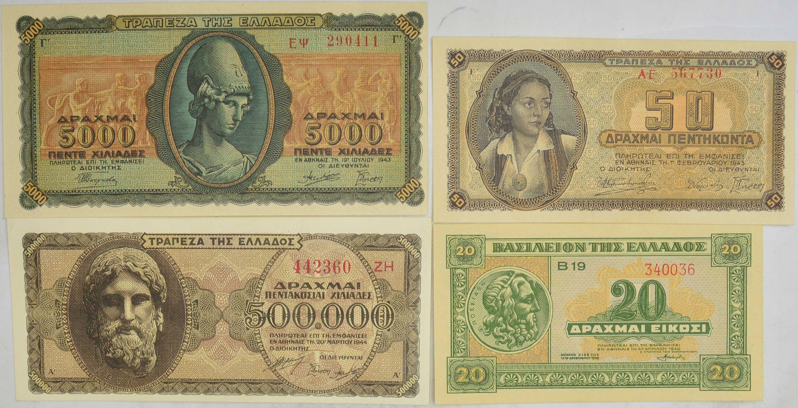 - Опис: У набір входять банкноти з номінал: 20 драхм 1940 р., 50 драхм 1943 р., 5 000 драхм 1943 р., 500 000 драхм 1944 р.