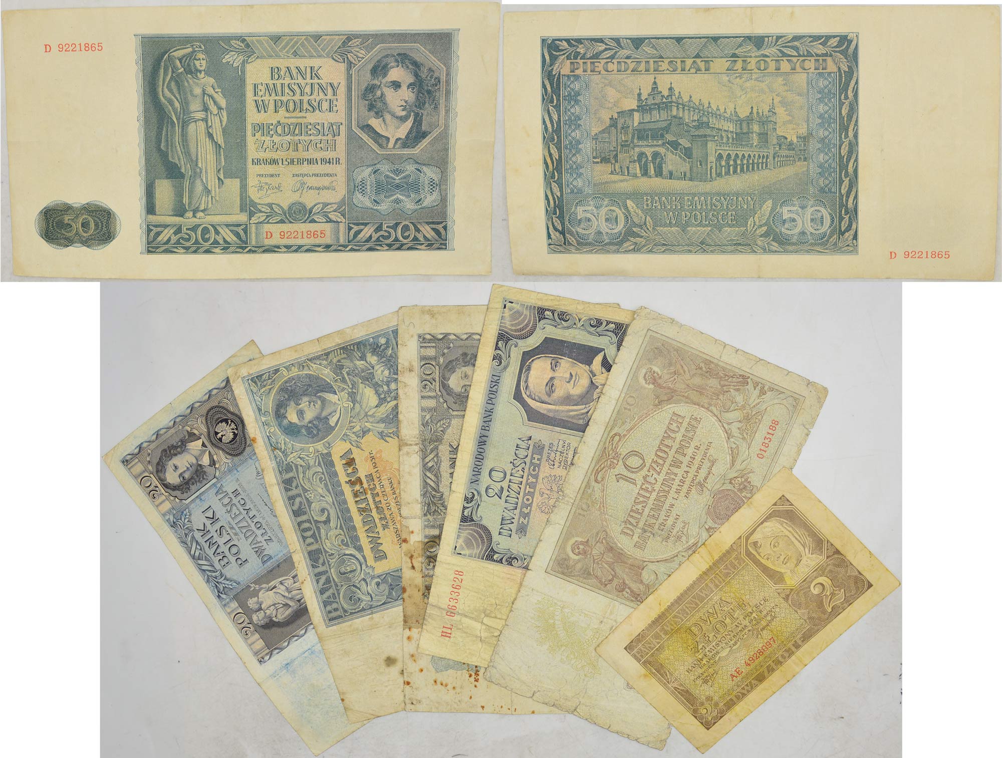 - Опис: У набір входять банкноти наступних номіналів: II RP - 20 PLN 1931 CG., 1936 BU, GG - 2 PLN 1941 AE, 10 PLN 1940 C, 20 PLN 1940 , 50 PLN 1941 D, PRL - 20 Zlotych 1948 HL