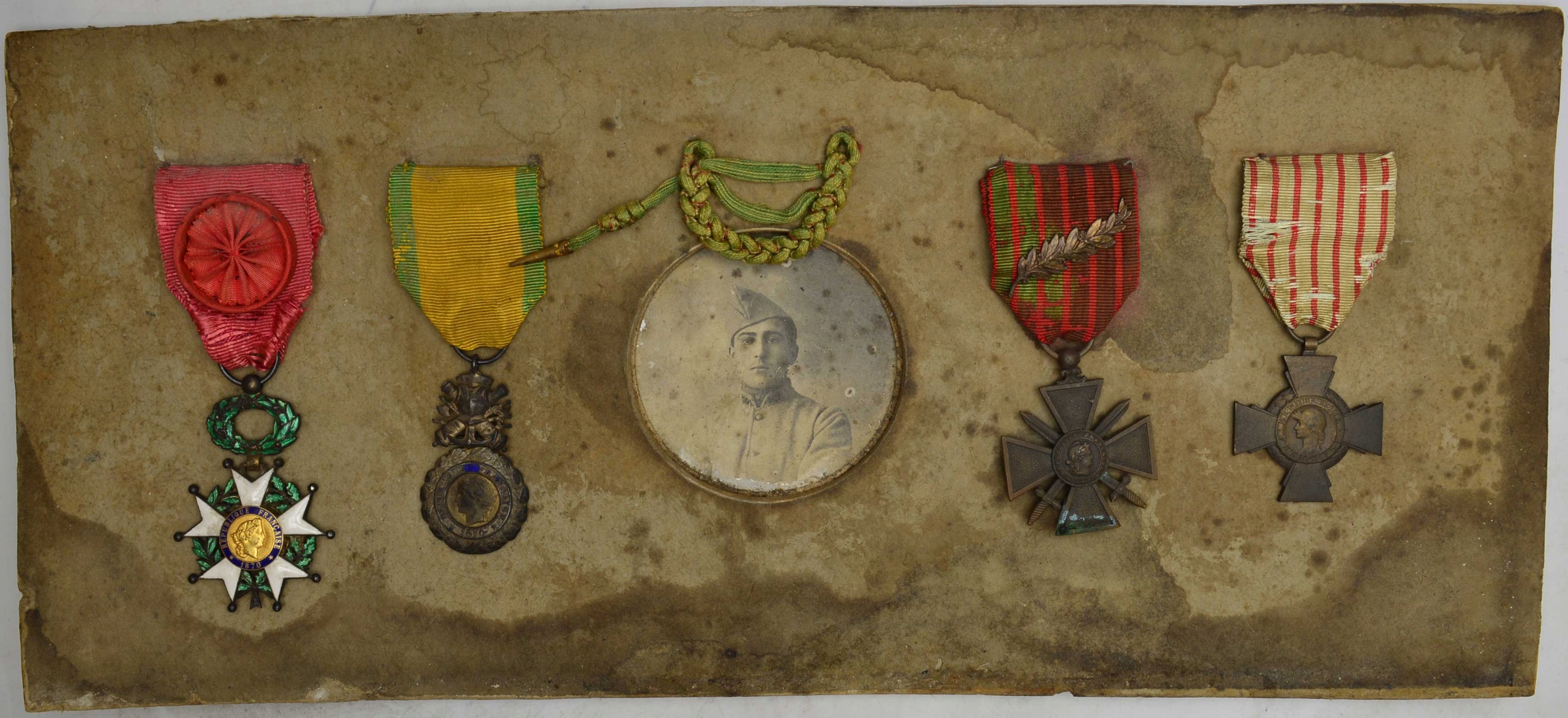 - Опис: У набір входять відзнаки: Офіцерський хрест ордена Легіону Честь, 4 клас; Croix de Guerre з бронзовою пальмою 1914-1917 рр.; Військова медаль (1870-1951); Ветеранський хрест Першої світової війни, мундирний шнур. Нагороди розміщені на картонній дошці з фотографією французького солдата. Плата пошкоджена та потребує заміни (знебарвлення, відсутність плям). Розміри сувенірної дошки 37,5 см х 17 см.