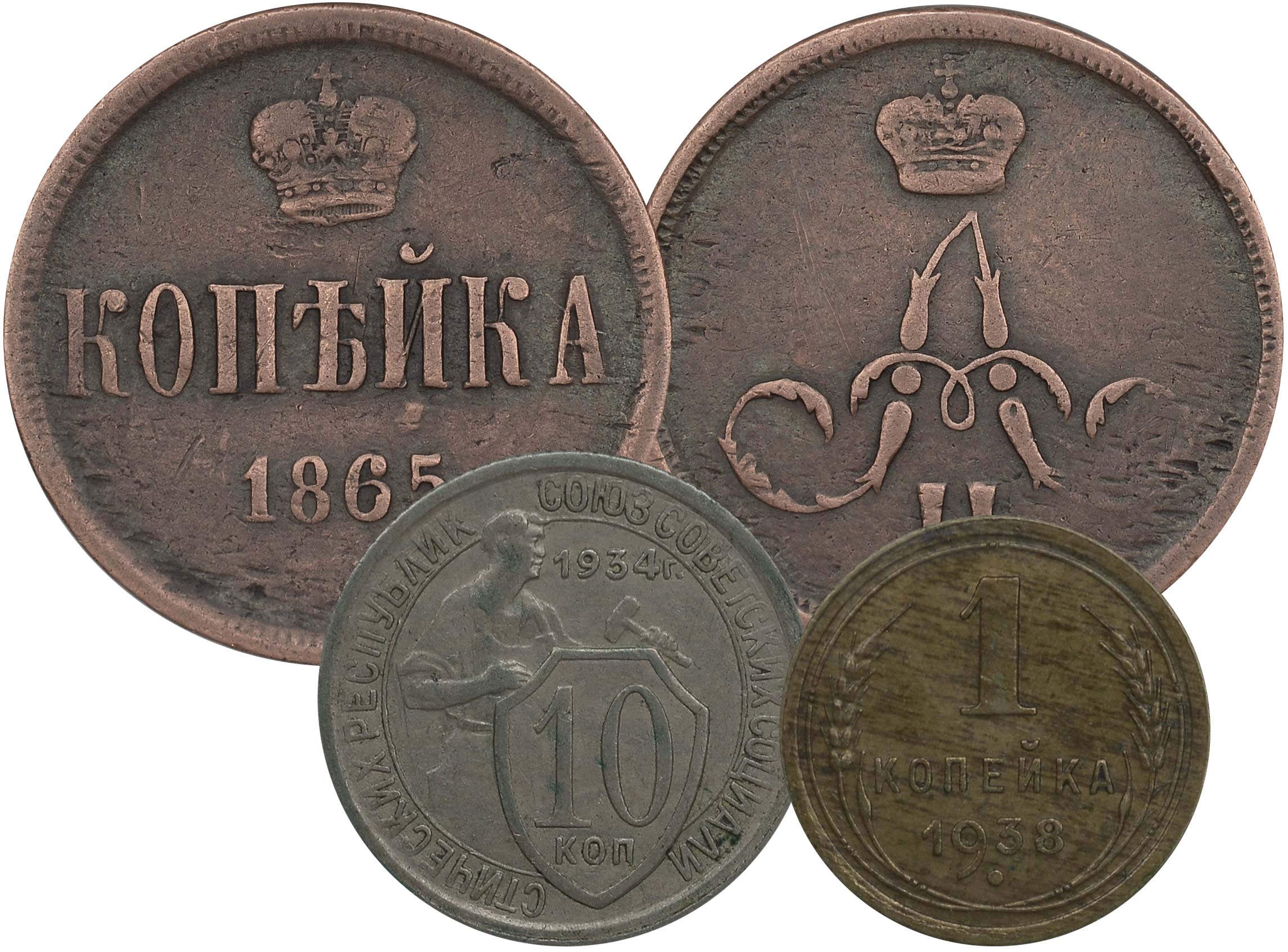 - Опис: До набору входять монети номіналом: 1 копійка 1865 р. ?М, 1938 р.; 10 копійок 1934 р. рідко.