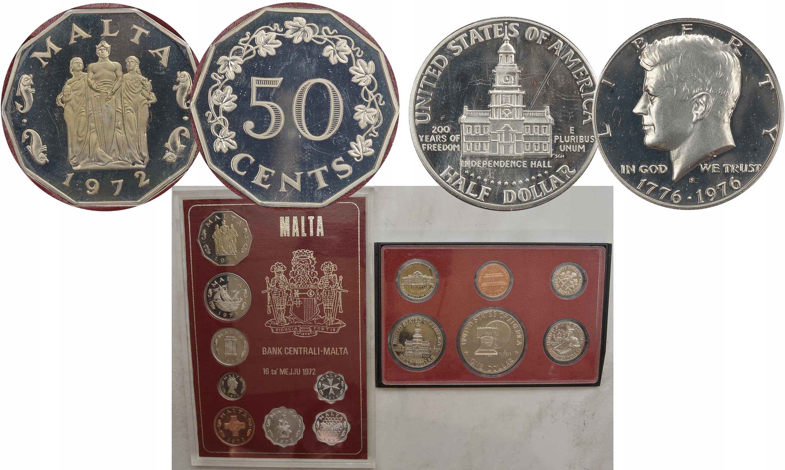 - Опис: два монетні набори містять монети: Мальта , набір з 8 монет - 2 міли, 3 міли, 5 мілів, 1 цент, 2 центи, 5 центів, 10 центів, 50 центів - все 1972 р.; США, набір із 6 монет — 1 цент, 5 центів, 10 центів, 1/4 долара, 1/2 долара, 1 долар — усі 1976 S 200 років США '1776. Обидва набори в оригінальній упаковці. Фотографії монет були зроблені через захисний пластик. Якщо ви виграєте більше аукціонів, вартість доставки буде визначено.