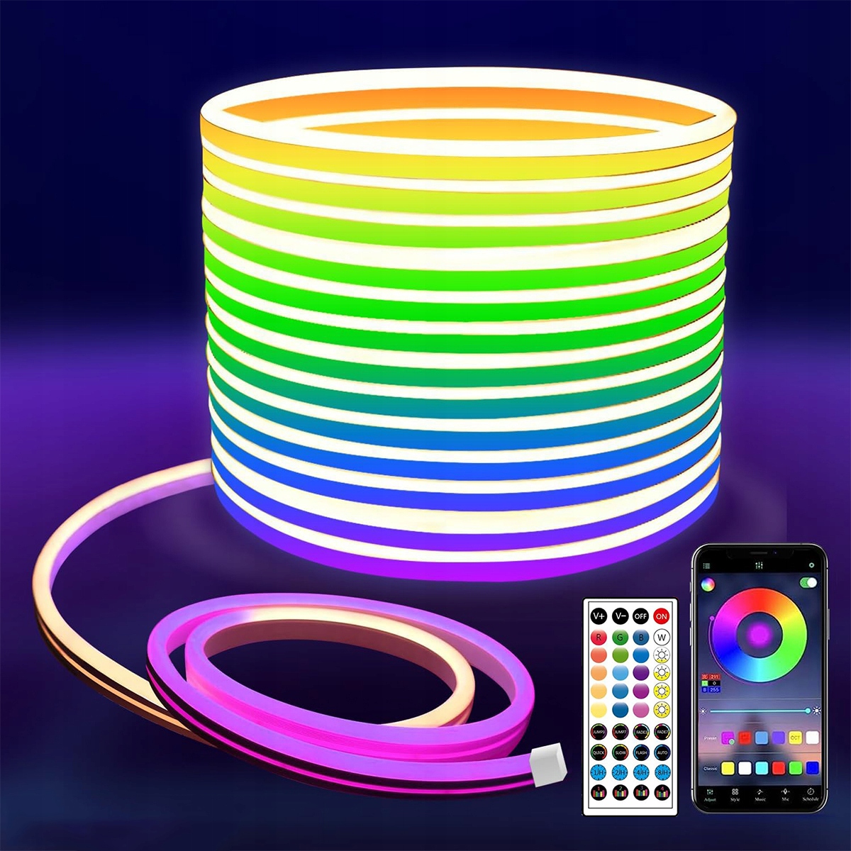 Надзвичайно яскрава: світлодіодна неонова світлова стрічка складається з 360/720/1440 світлодіодів (72 світлодіоди на метр). Покращена світлодіодна стрічка світить яскравіше звичайної світлодіодної стрічки. Зона проекції 120 градусів забезпечує широкий діапазон освітлення. Світло дуже рівне. Ви можете вибрати улюблений колір або режим за допомогою програми або пульта дистанційного керування, а потім встановити відповідний час для вимкнення світла. Під час повторного використання світлодіодна стрічка автоматично запам’ятовує останній колір або режим.