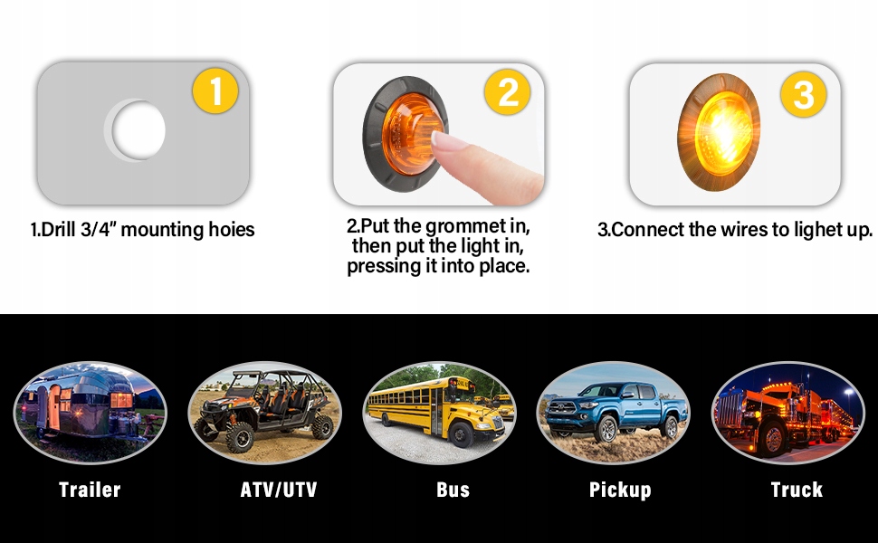 Універсальний для всіх автомобілів 12V і 24V. Ідеально підходить для причепів, вантажівок, автобусів, пікапів, позашляховиків, Wrangler, ATV, UTV, фургонів, напівпричепів, кемперів, причепів для човнів, позашляховиків, кемперів, автомобілів з кабінами, вантажівок тощо.