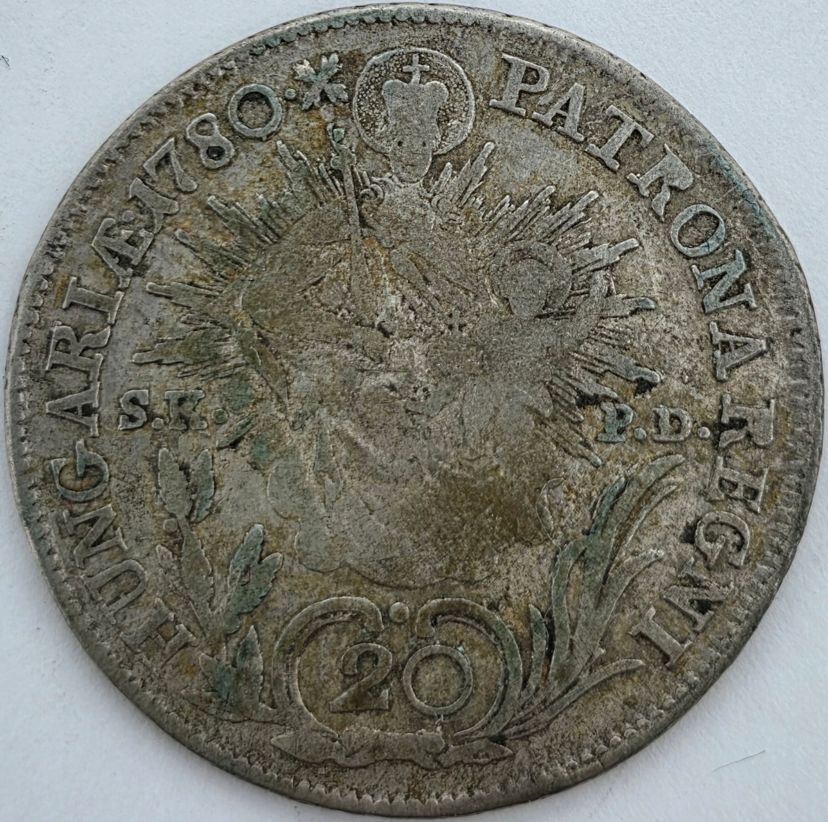 Продається оригінальна монета в 20 Kreuzer (20 krajcars) 1780 року, викарбувана під час правління імператриці Марії Терезії. Тип у народі називають «Patrona Regni» через характерну іконографію реверсу.