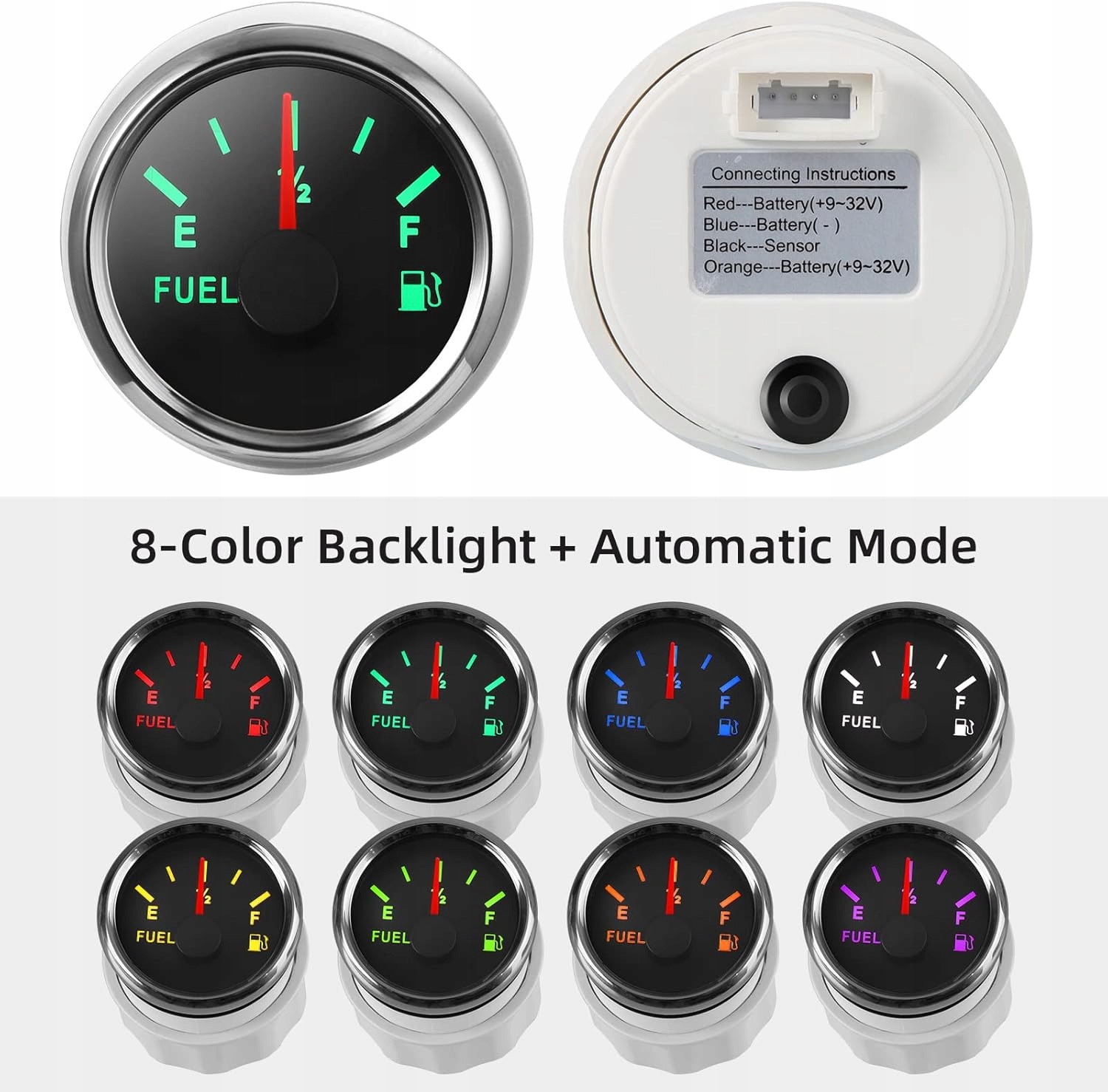 [легко читання]: Індикатор рівня палива має 8 регульованих кольорів підсвічування, є водонепроникним IP67, має рамку з нержавіючої сталі, вигнута склянка, що запобігає випаровуванню і його легко читати і його легко прочитати (порожня-1/2-TOP). 4