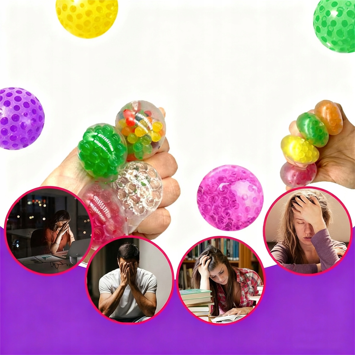 Після частого використання м’яких стрес-м’ячів ми рекомендуємо мити їх теплою водою з милом. Для забезпечення приємних відчуттів і запобігання прилипання рекомендується рівномірно посипати поверхню міні-кульок невеликою кількістю дитячої присипки.