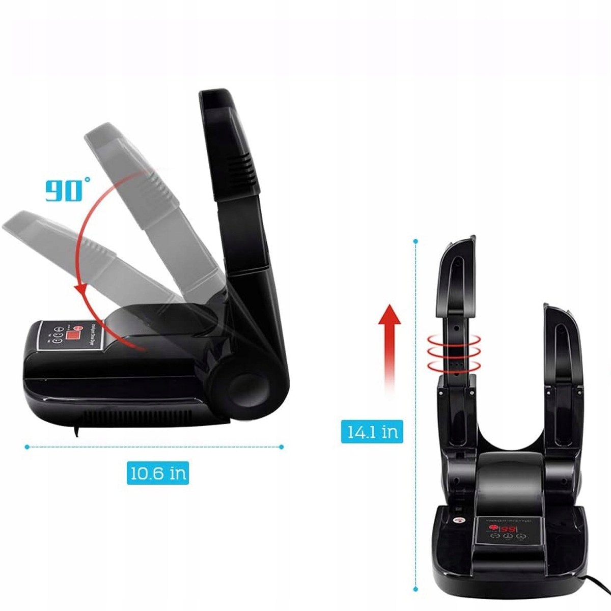 Структура була розроблена для відповідності плагінам ЄС, а конструкція, складена під кутом 90 °, гарантує, що сушарка електричного взуття є портативною та легкою для зберігання. Незалежно від того, ви ходите на відкритому повітрі чи з рюкзаком, ви можете легко носити його і тримати взуття завжди сухим та чистим, тому подорож буде зручніше та приємнішим.