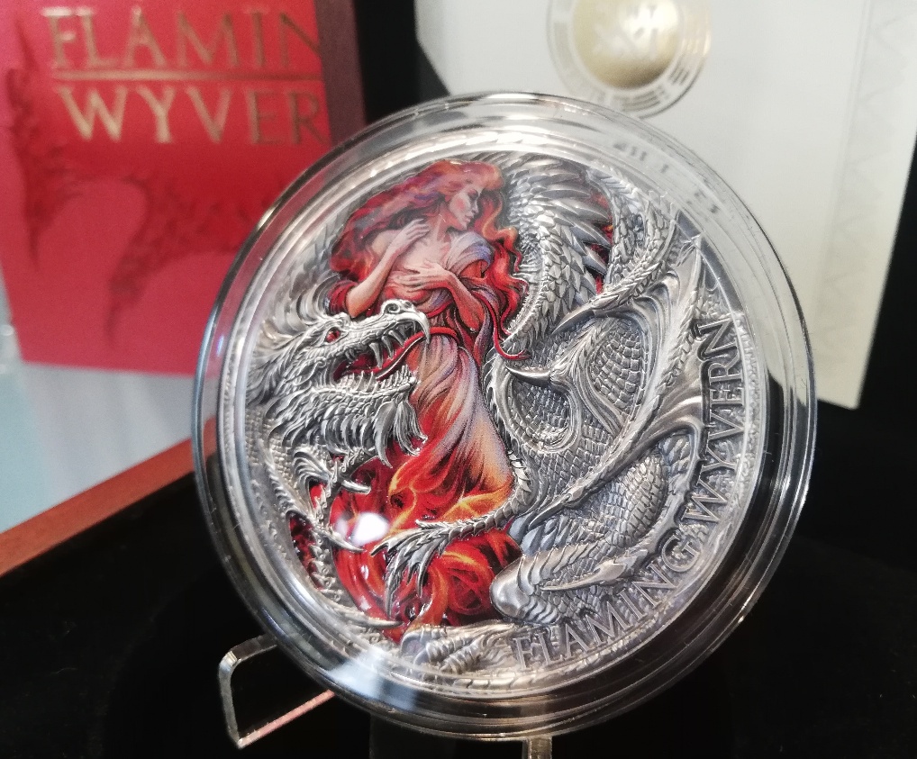 На монеті Палаюча виверна в 2 унції зображено двоногого крилатого дракона. Делікатно вирізані зуби, шкіра, кігті та крила стають реалістичними завдяки техніці високого рельєфу. Ця монета стане прекрасним доповненням до вашої нумізматичної колекції.