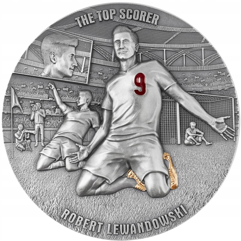 Спортивні емоції та смак перемоги на іншій монеті з Робертом Левандовскі. Випуск «Король стрільців» із серії «Роберт Левандовскі, Дорога до мрій» викарбовано з двох унцій чистого срібла 999 проби обмеженим тиражем лише 1000 штук, найнижча з попередніх монет цієї серії.