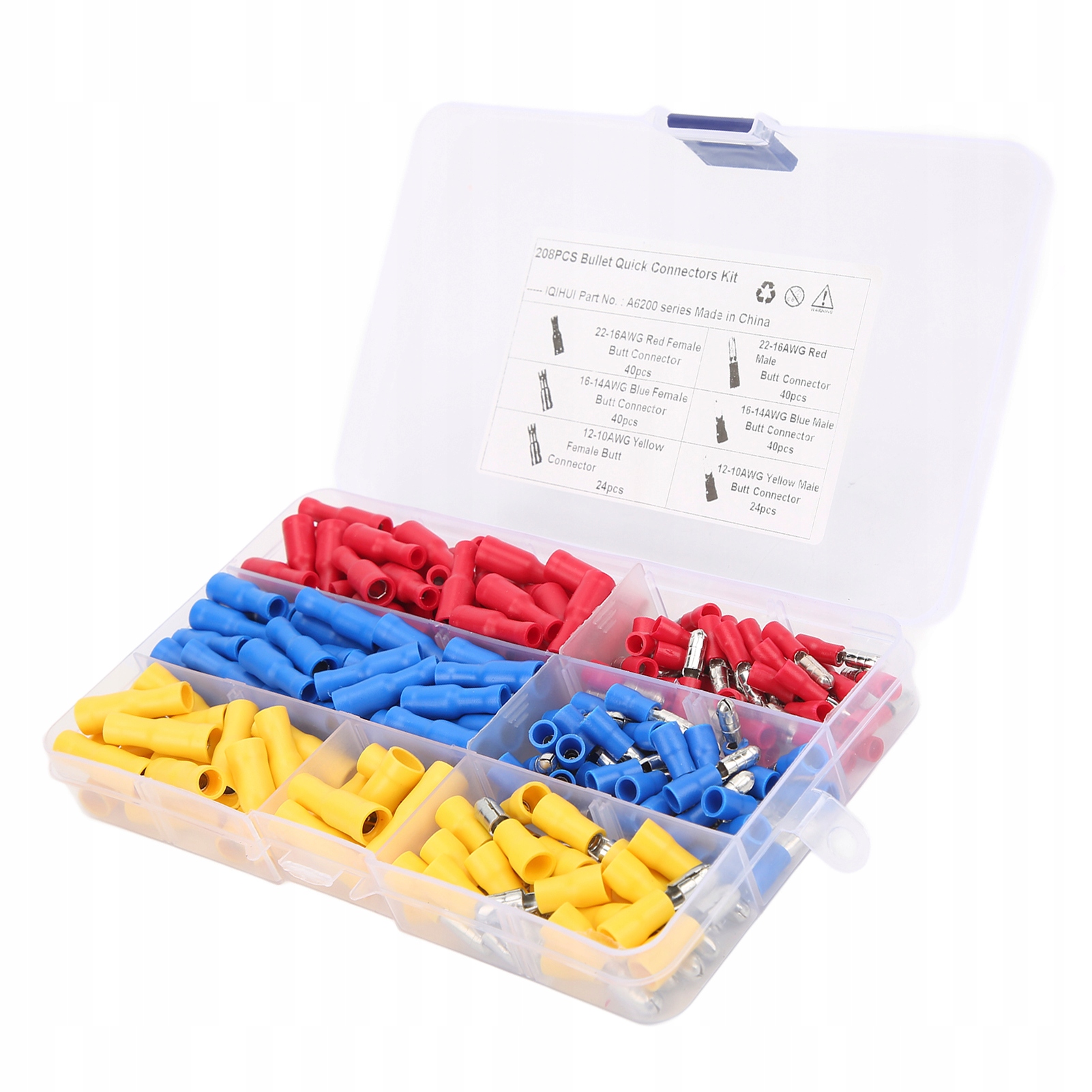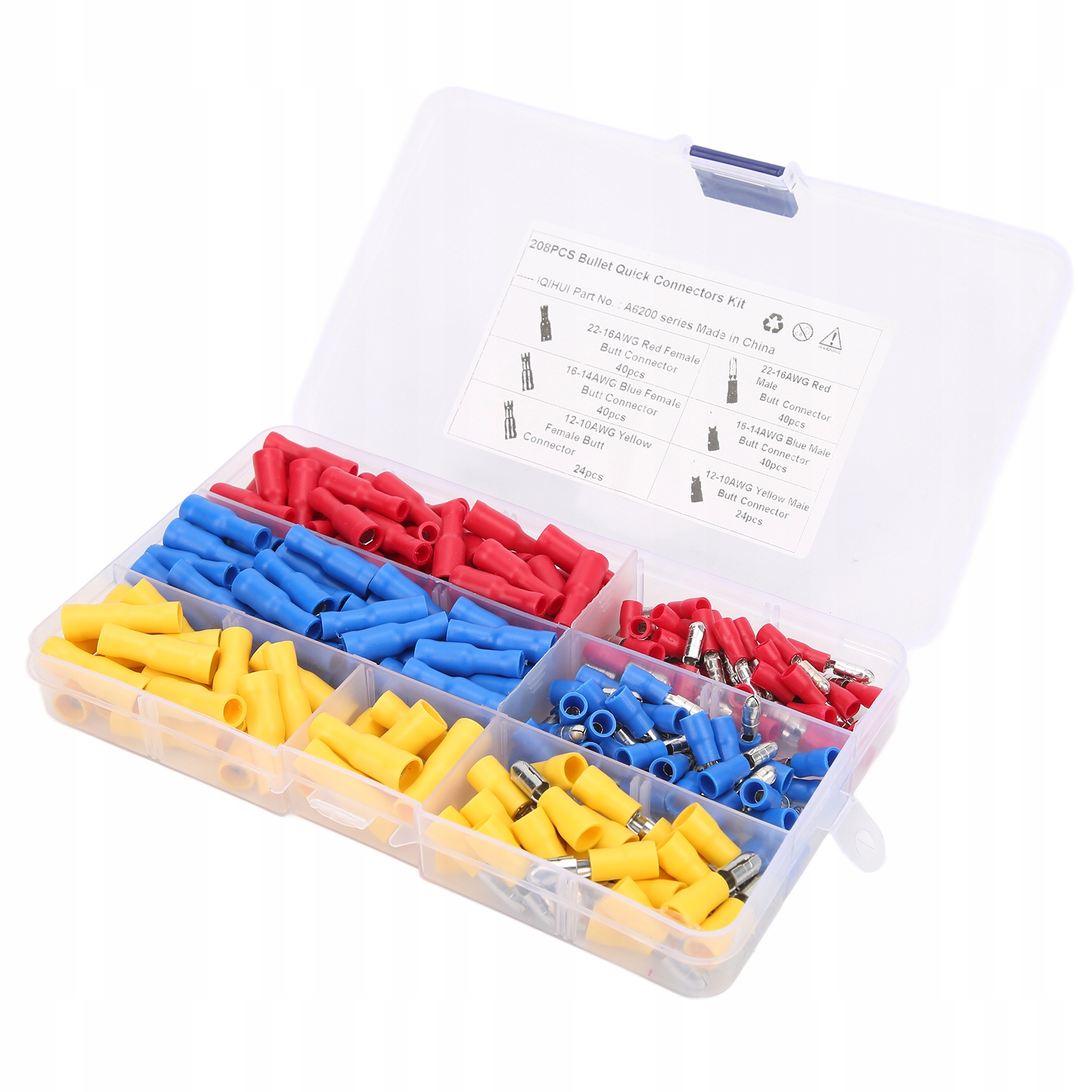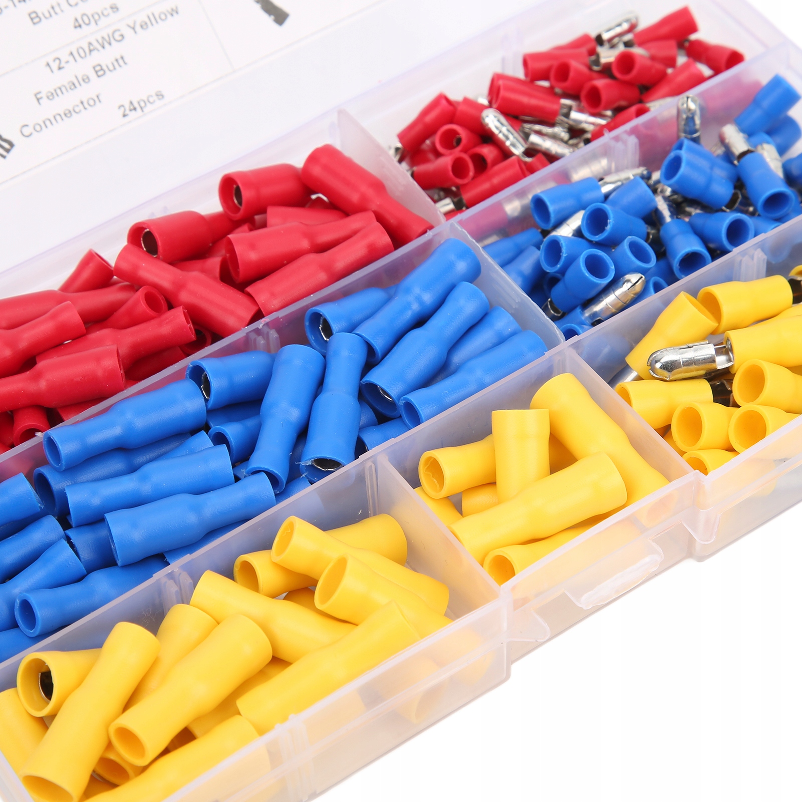 3. Він охоплює 40pcs 22–16awg Червоний самець, 40шт 22–16awg Червона самка зчеплення 40шт, 40шт 16–14Awg Синій Чоловічий роз'єм, 40шт 16-14AWG Жінка, 24pcs 12-10Awg Жовтий Чоловічий роз'єм, 24pc 12-10Awg Жінка.