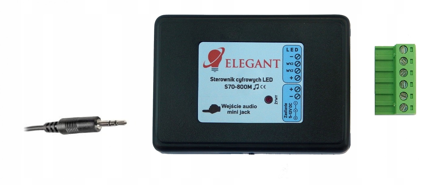 Контролер S70-800M, оснащений входом mini jack, завдяки вбудованим 90 програмам дозволяє отримувати унікальні динамічні послідовності та анімації, що працюють у ритмі музики (програми реагують на низькі, середні та високі тони та темп пісні).-сенсорний пульт, ми можемо коригувати колір, яскравість, змінювати програми або використовувати автоматичний режим - програми змінюватимуться автоматично кожні 1 хвилину. Драйвер підтримує загалом 1000 пікселів (500 для кожного з двох виходів).