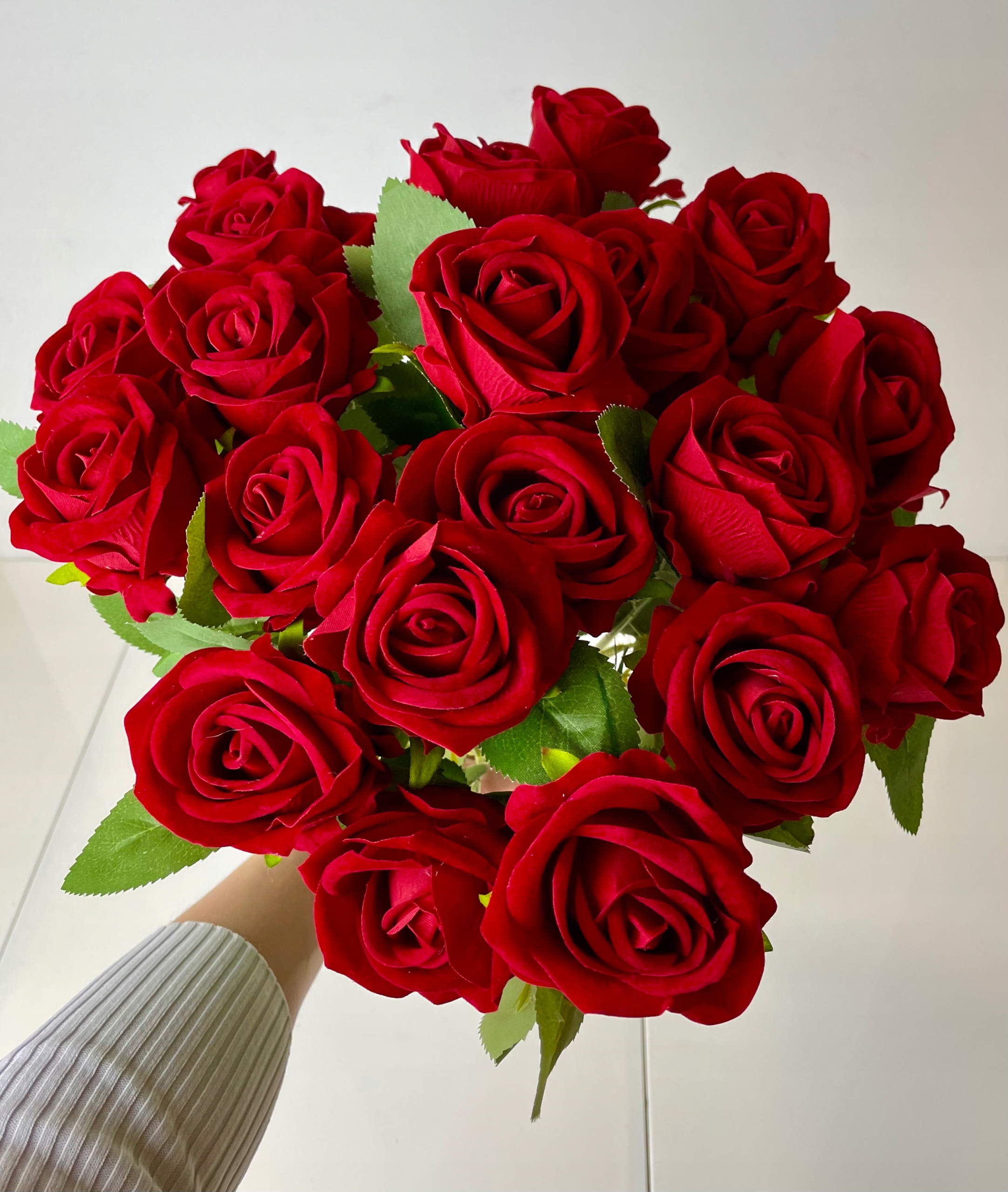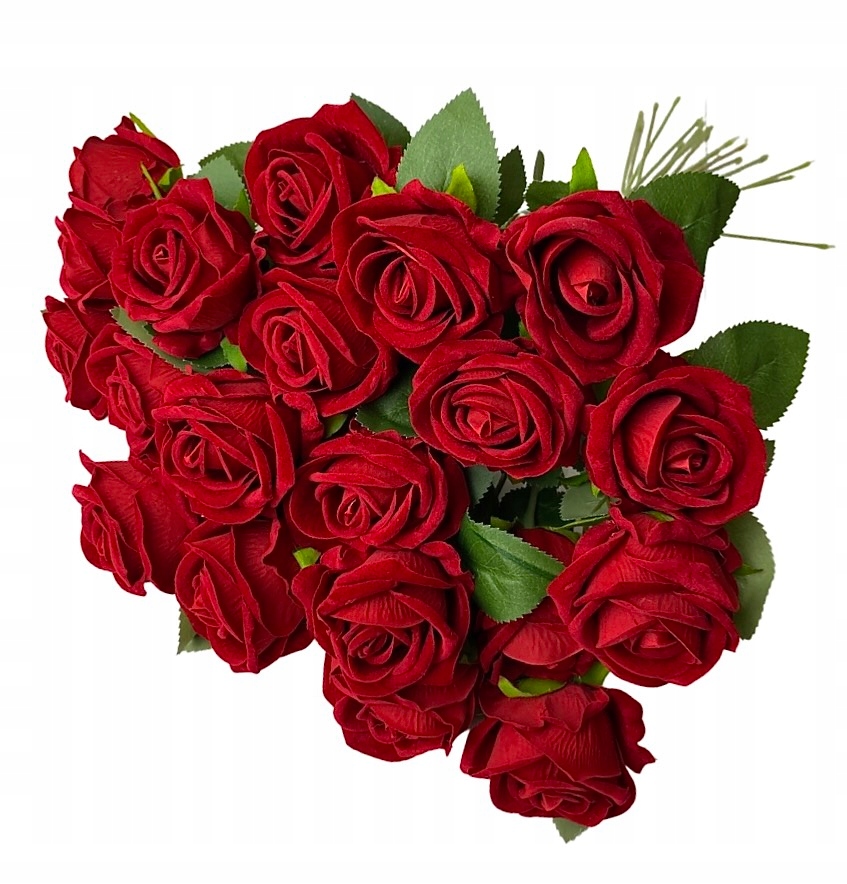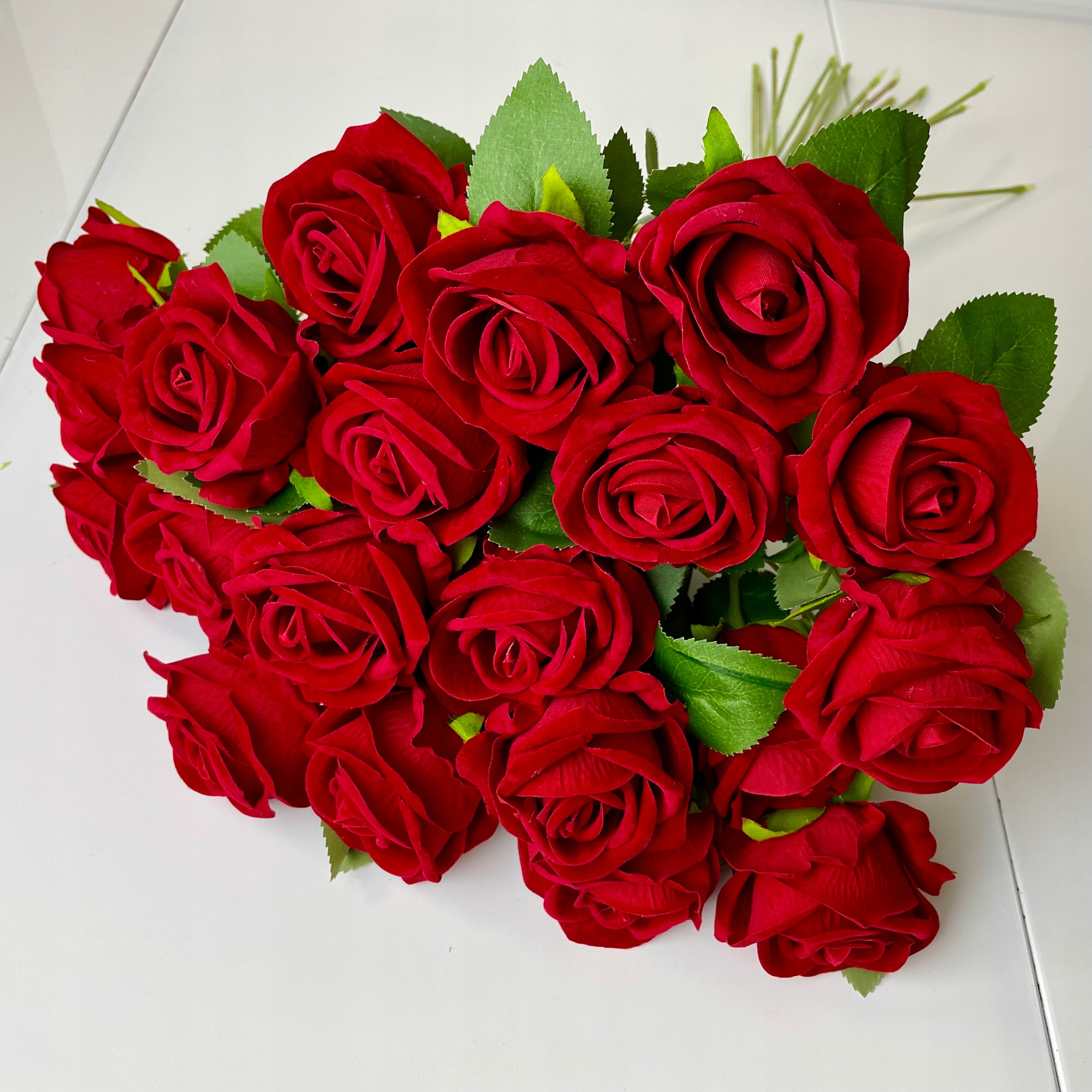 Букет червоних троянд. Головка червоної троянди виготовлена з високоякісного оксамитового флокованого матеріалу. Завдяки цьому він оксамитовий і ніжний на дотик. Головки кріпляться на дроті, покритому пластиком і обробленому тканинними листочками, завдяки чому ми можемо згинати і формувати троянди в букетах і композиціях. Вони ідеально підходять для ваз, великих квіткових горщиків, оформлення заходів та ресторанів. Ми особливо рекомендуємо їх на День святого Валентина, Різдво та як весільний букет квітів.