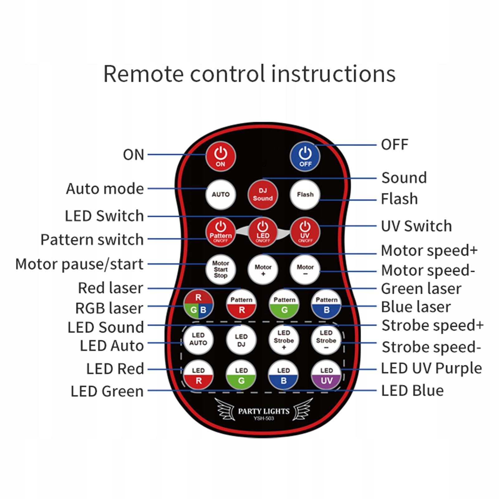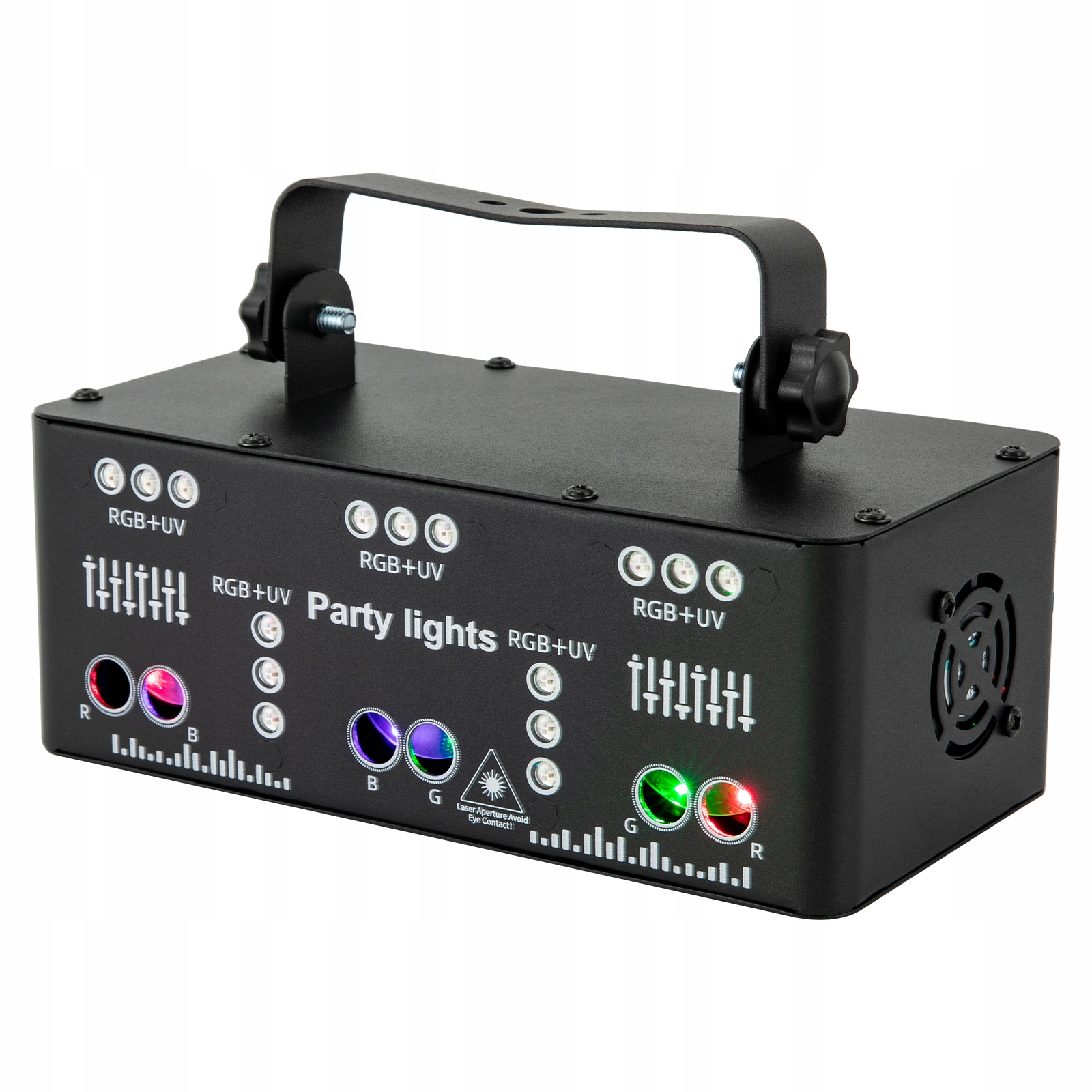 пульт дистанційного керування: пульт дистанційного керування з інфрачервоним приймачем може отримувати довгі сигнали відстані до 16 футів для управління вмиканням/вимкненням продукту, звуку DJ, строб, світлого кольору, стробової швидкості тощо. Вбудований вентилятор охолодження, розсіювання тепла з обох сторін, а термічна материнська плата може заважати теплом у часі та подовжити життя продукту.