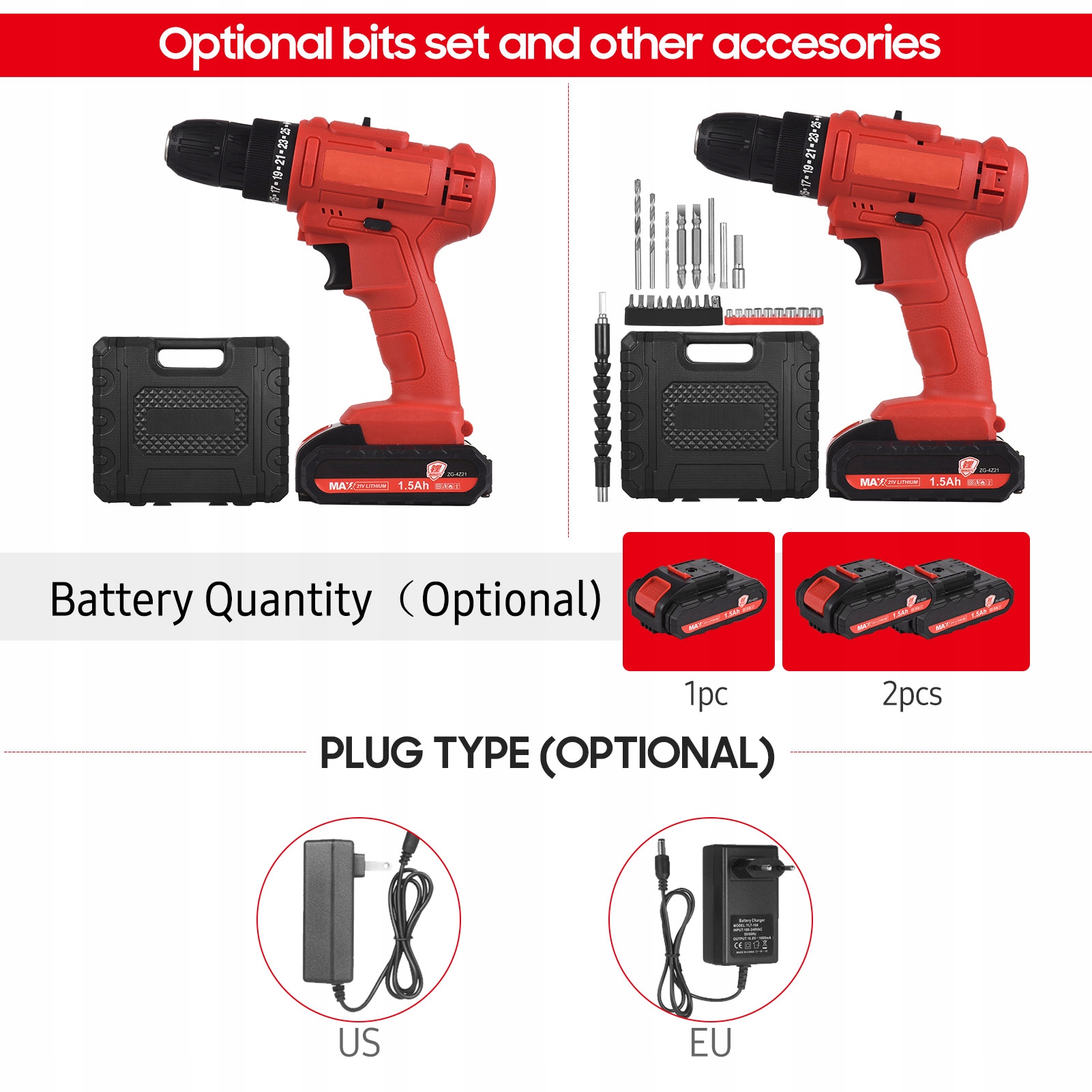 - Портативна ручна електрична дриль на 21 В з літієвою батареєю та швидким зарядним пристроєм є практичним інструментом для буріння. Він простий у використанні та портативний для транспортування, його можна використовувати для домашньої реконструкції, саморобних робіт, деревообробки, садівництва, ремонту автомобілів тощо!
