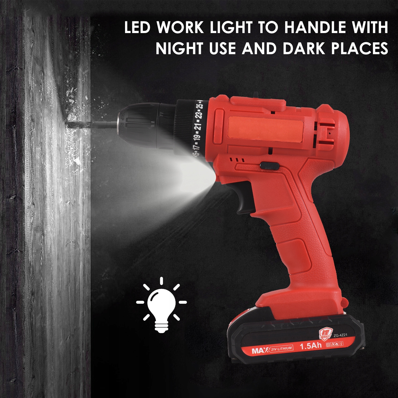 2. БЕЗПЕЧНА КОНСТРУКЦІЯ, літієва батарея 21 В 1500 мАг для надійної роботи та швидкого й легкого заряджання через обладнаний 2. Регулювання швидкості для різних потреб; світлодіодне освітлення для роботи вночі та в темних місцях; тривалий термін експлуатації. ящик для інструментів.