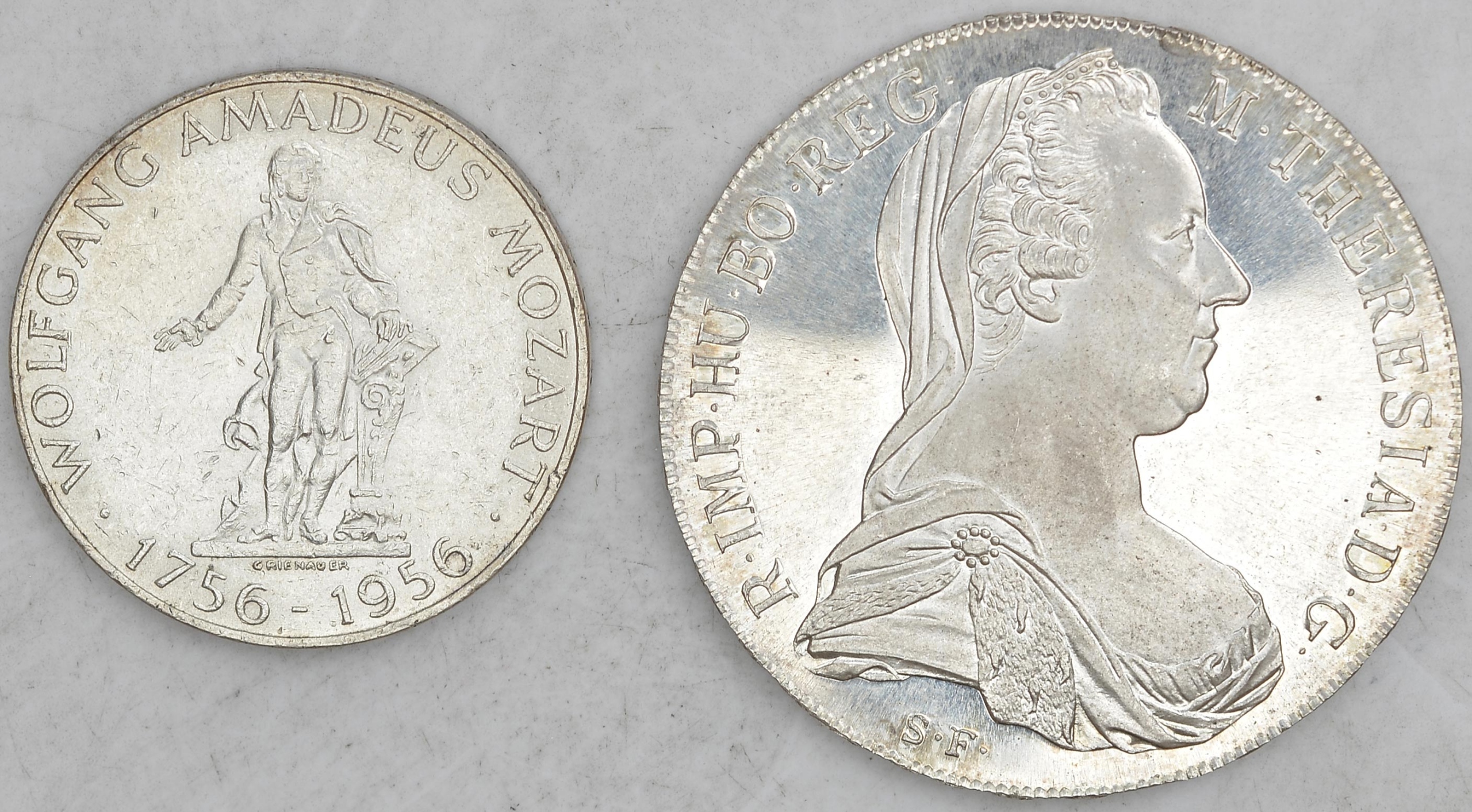 - Опис: набір містить монети номіналом: 25 шилінгів 1956 року Моцарт (срібло, 800 проби, вага згідно з каталог - 13,0 г ); 1 талер 1780 SF (срібло, проба 833, вага за каталогом - 28,06 г), нове карбування. Патина. Якщо ви виграєте більше аукціонів, вартість доставки буде визначено.
