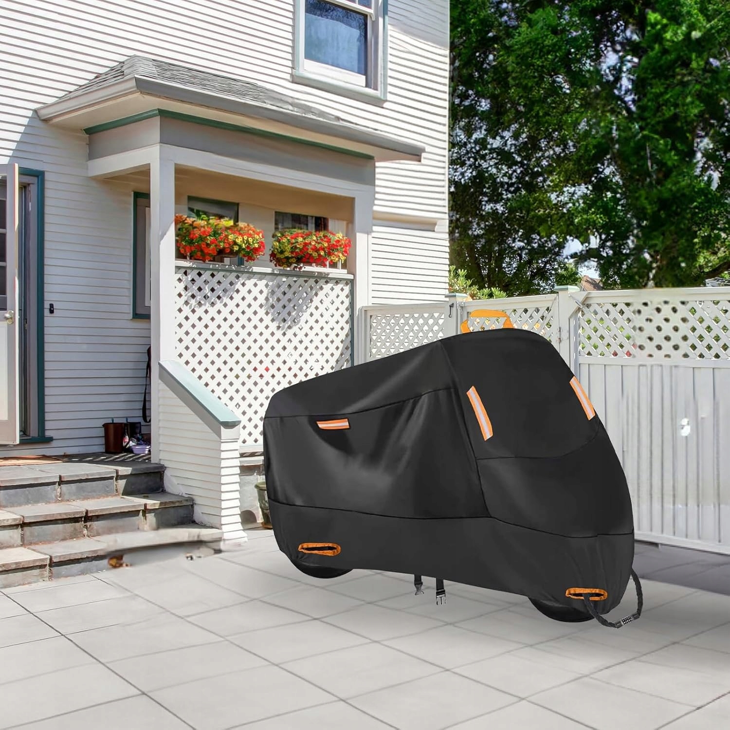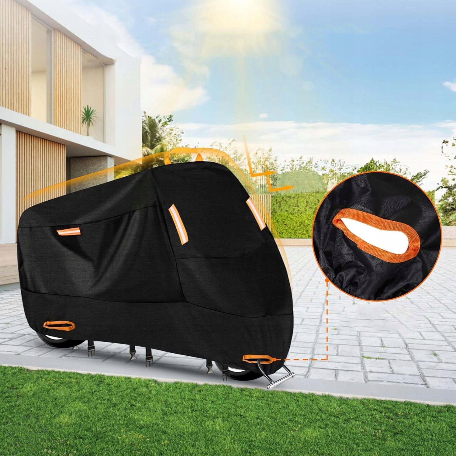 Цей зовнішній мотоциклетний чохол має чотири світловідбиваючі смуги високої видимості – дві спереду та дві ззаду. Це полегшує пошук вашого мотоцикла та залишає його видимим у темряві. Чохол також має стрічкову ручку вгорі. Примітка. Не використовуйте гострі декоративні предмети, оскільки це може порвати кришку.