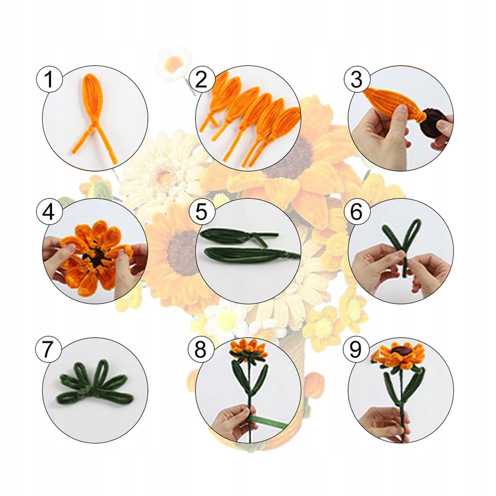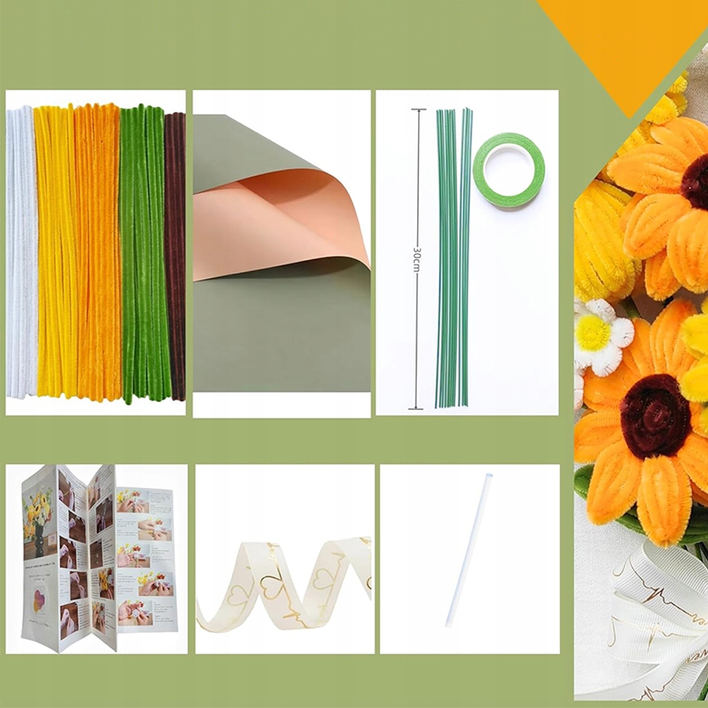 Цей продукт містить усі необхідні матеріали для виготовлення букета соняшників – інструкції, 210 зубочисток, 12 зелених дротів, пакувальний папір для подарунків, стрічки, клей і липку стрічку.