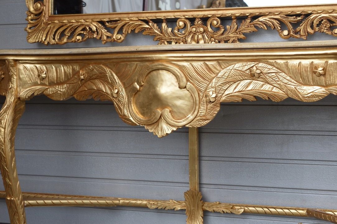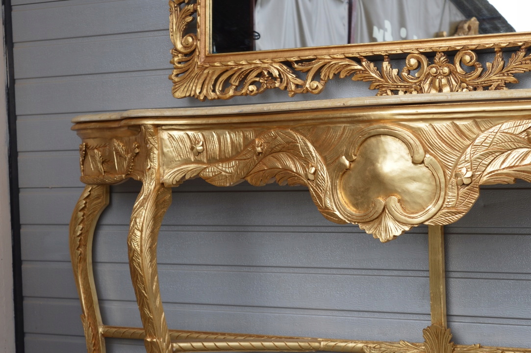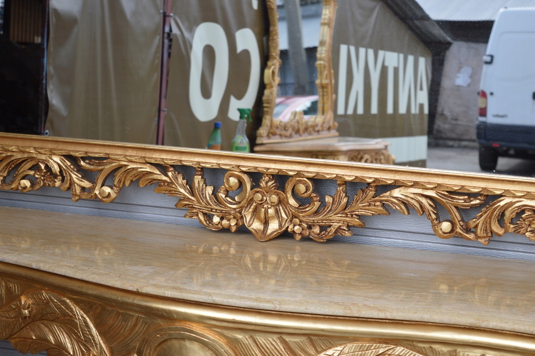 Привіт, сьогодні я хотів би запропонувати вам неймовірне золоте різьблене кришталеве дзеркало в красивій дерев'яній рамі з консоллю - все зроблено з дерева. Верх консолі з мармуру, дуже добротної роботи.