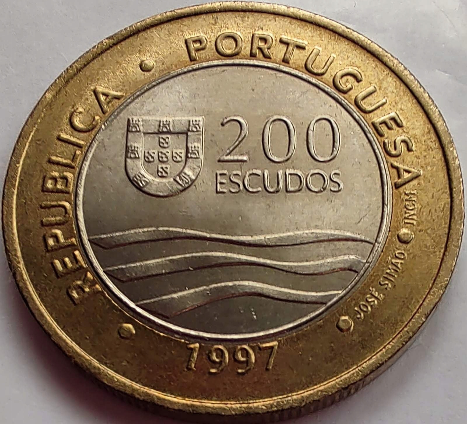 4 Деномінація: 200 Eskudo рік: 1997 Тема: Expo Lisbon 1998 зупинка: bimetal. Центр Мідзііоніка. Кільце нікелю латуні тип сторони: гладкі та зубчасті секції Форма: Круглі Акверс/реверс: , що повертається на 180 ° ваги (g): 9.8. 28 Товщина (мм): 2.2