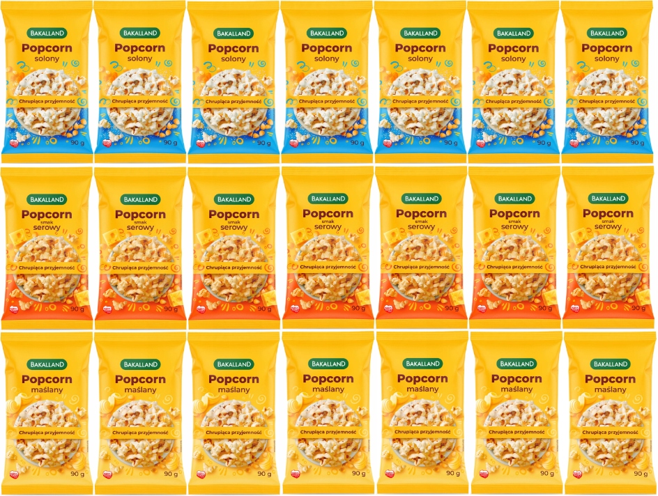 Попкорн із кукурудзяних зерен є чудовою альтернативою типовим солодким чи солоним закускам. Це також природне джерело харчових волокон. Попкорн Bakalland не містить штучних ароматизаторів та барвників. Приготування в мікрохвильовці спрощує процес смаження, гарантуючи хрустку хрустку.