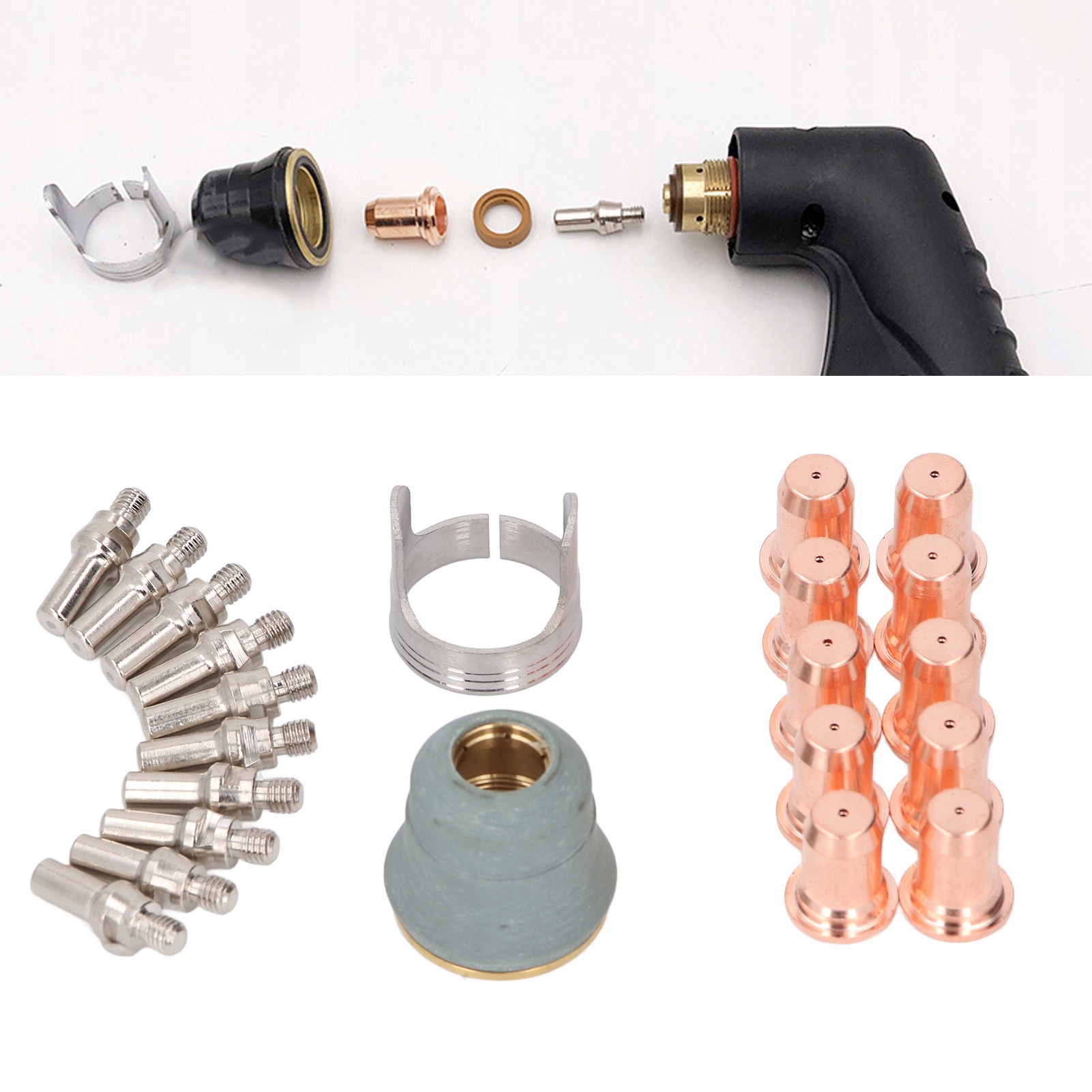 1. [Аксесуари для плазмового різання] Цей набір включає 10 електродів, 10 насадок, 1 захисну кришку та 1 розпірну напрямну, розроблену для плазмового різака PT60.