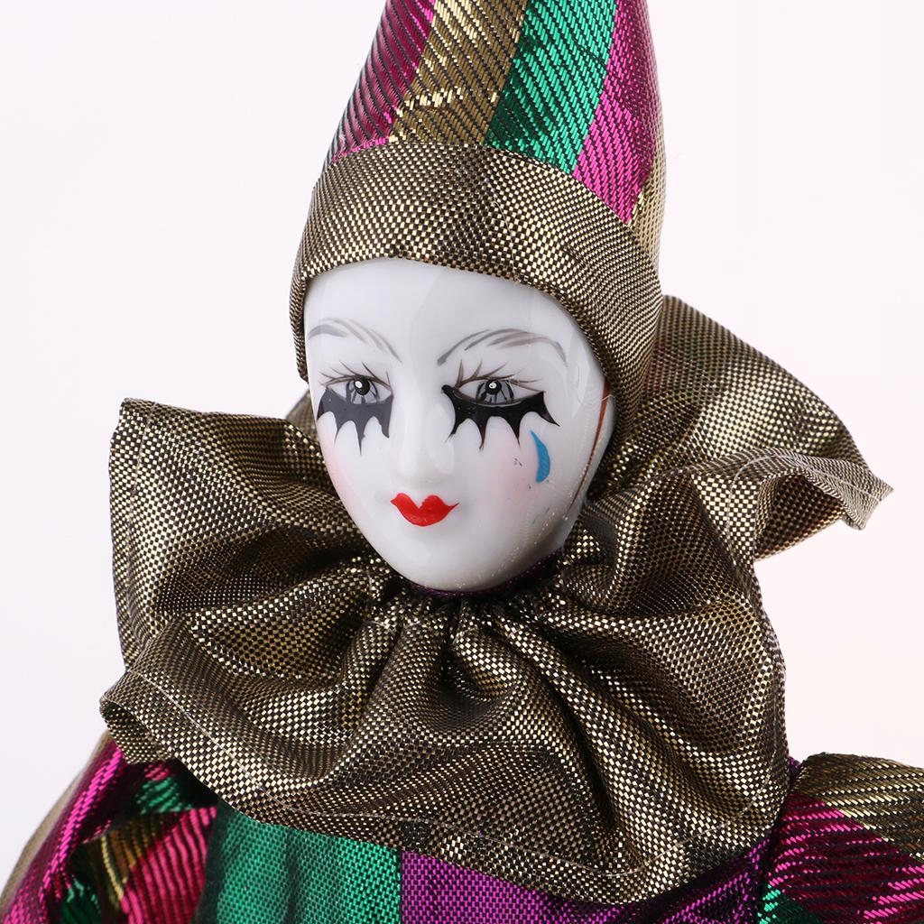 Голова та кінцівки цієї ляльки-клоуна виготовлені з порцеляни та порожнисті.