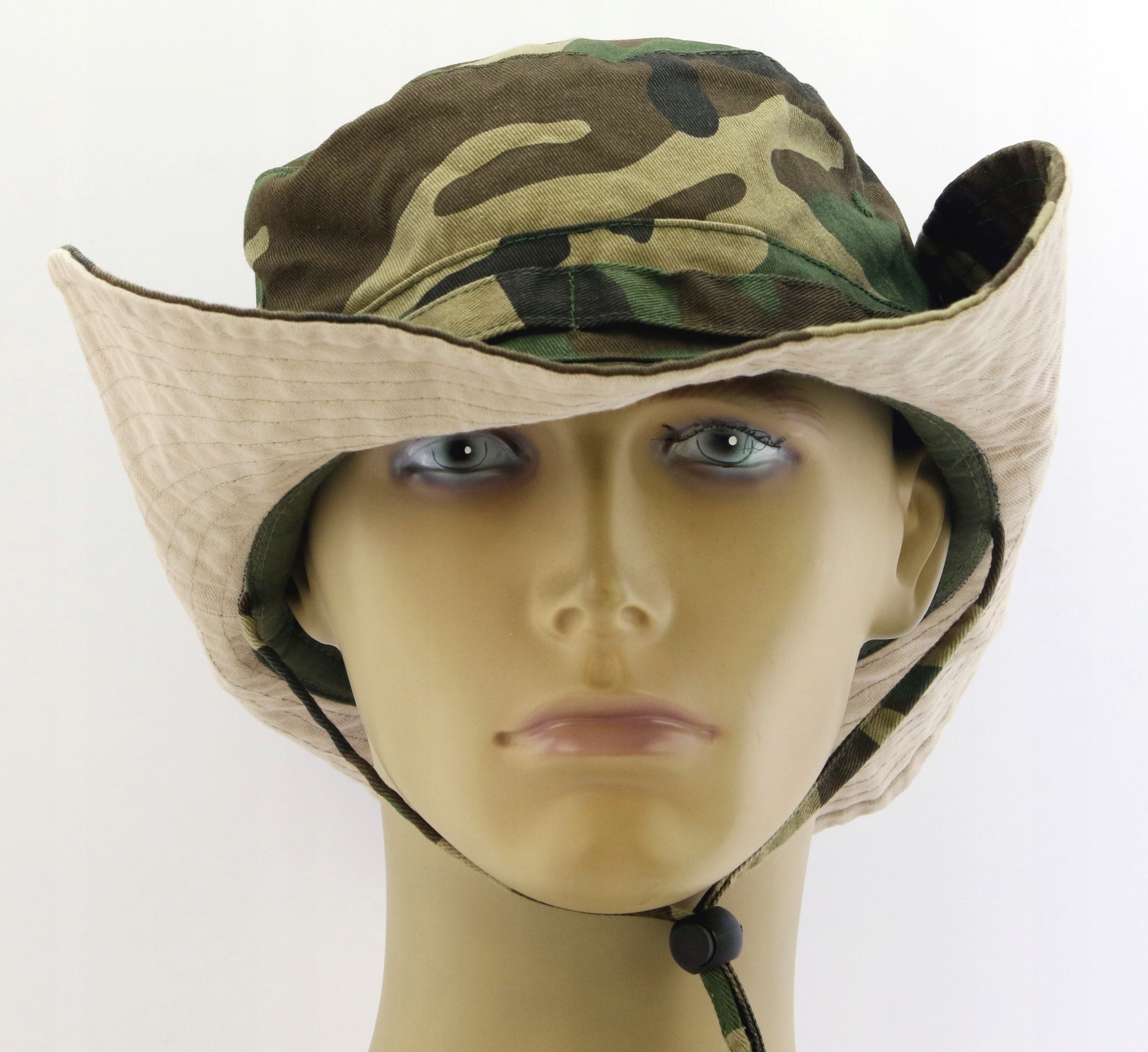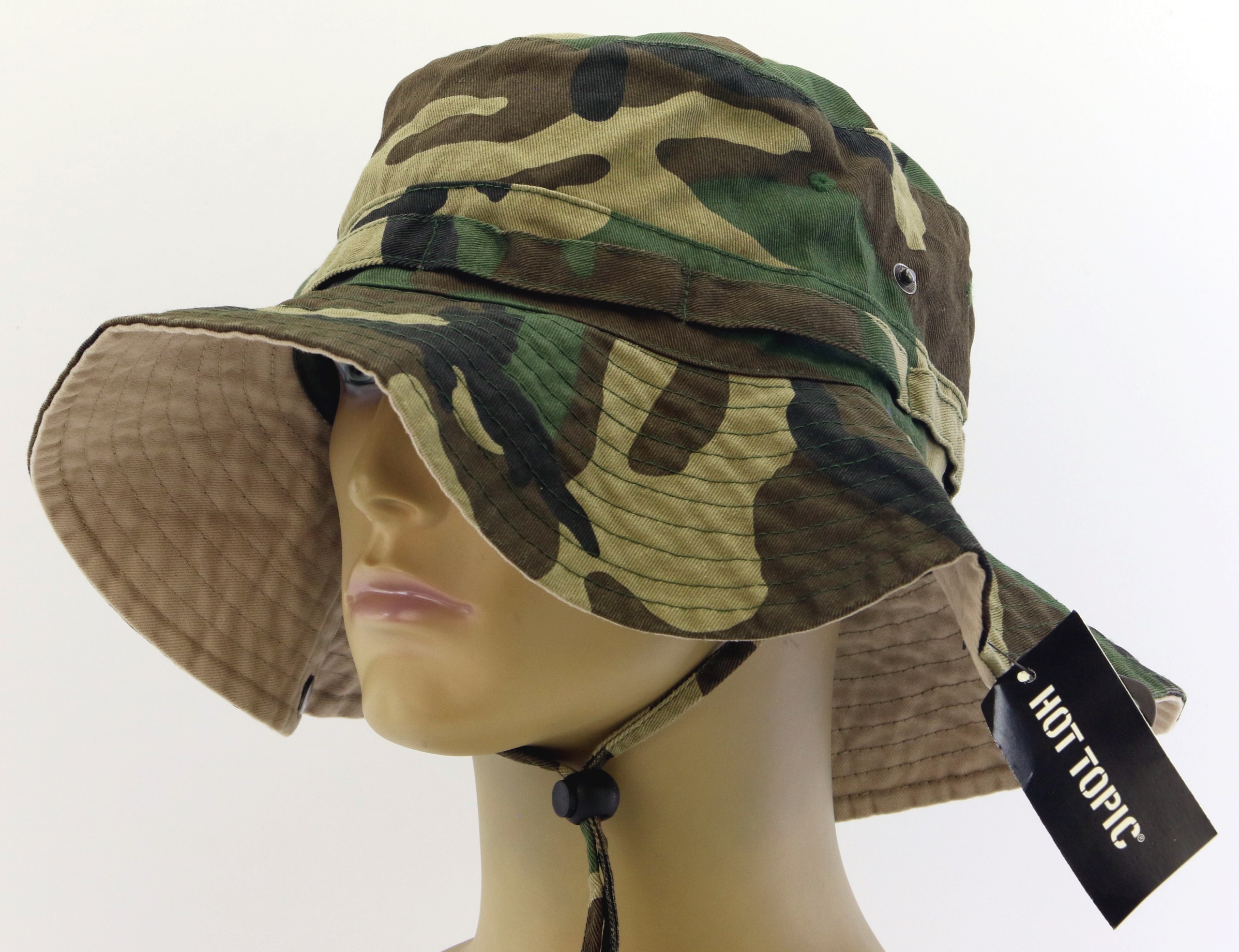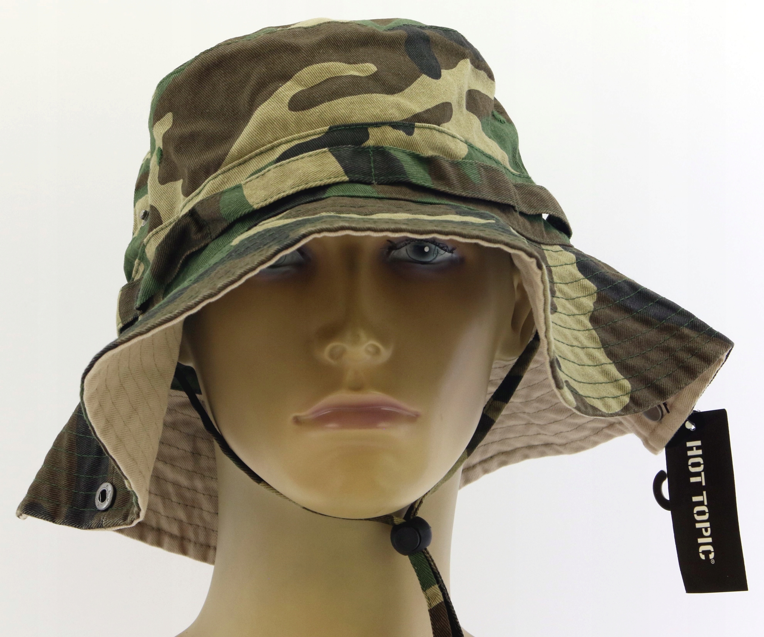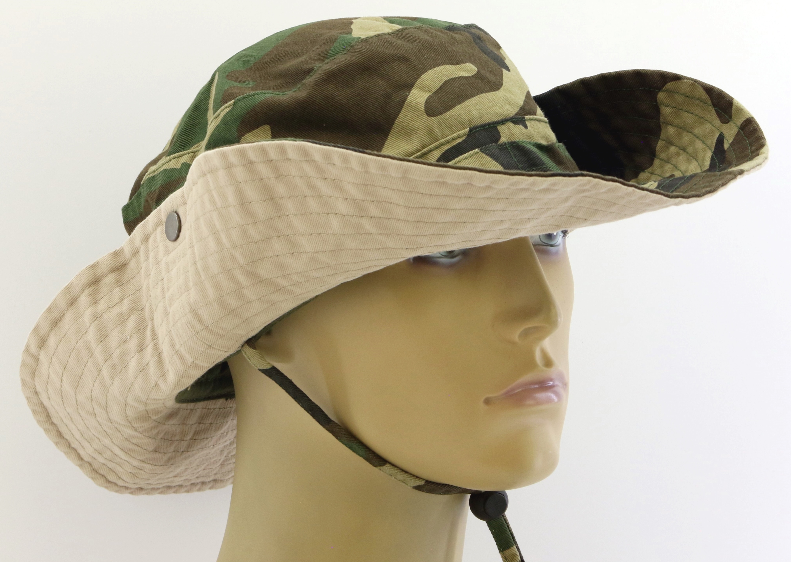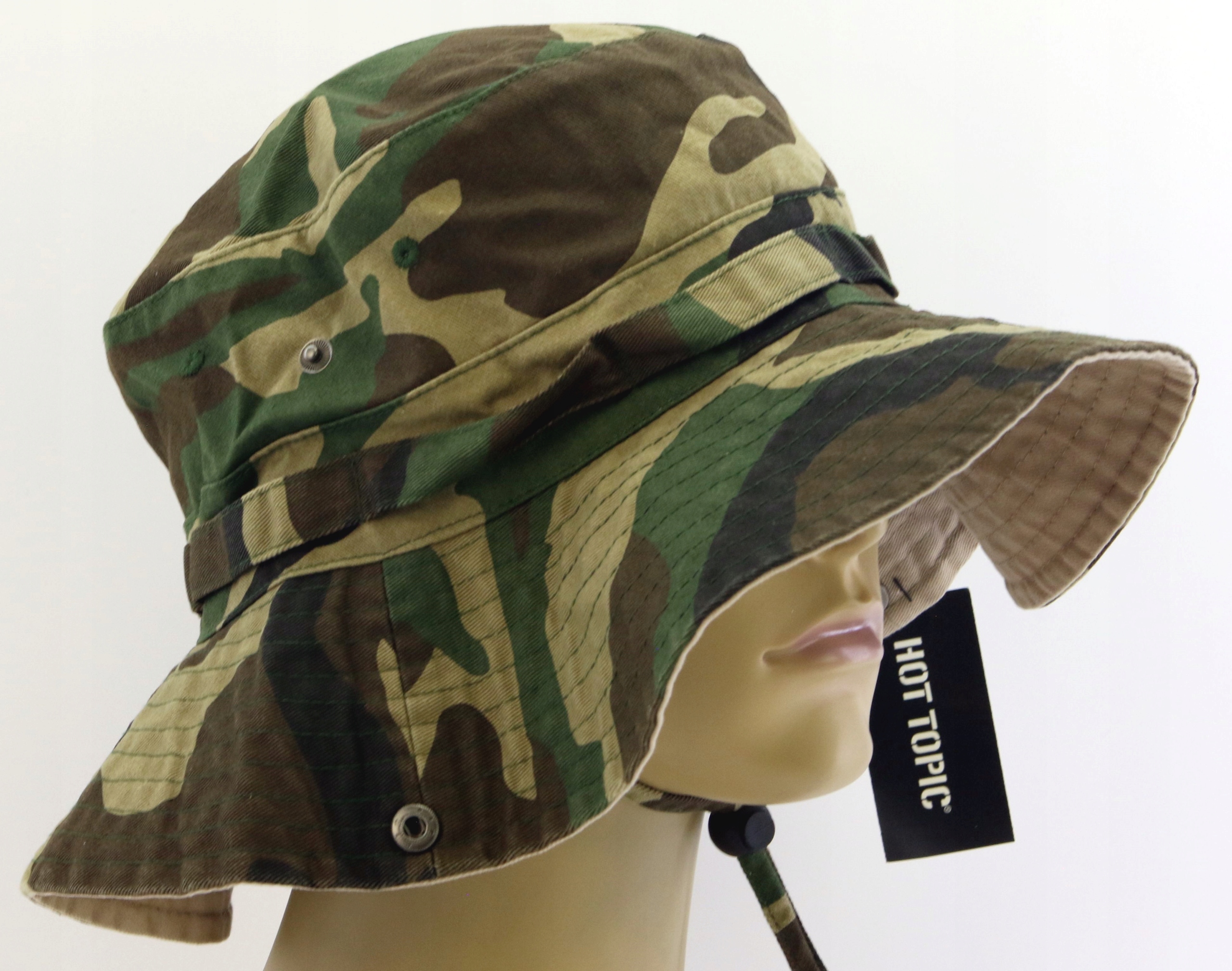Шапка має кліпси, які дозволяють її розгортати, і регульований шнурок, який запобігає падінню шапки з голови.