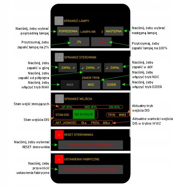 Якщо буде виявлено рух від виходу на мезоніні, контролер вмикатиме лампу освітлення за лампою, вгору та вниз, починаючи з антресоль (стиль: LED WAVE) або одночасно (стиль: РАЗОМ).