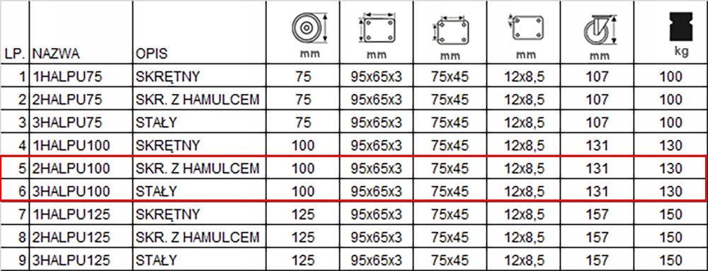 Набір складається з чотирьох коліс, оснащених пластиною. У комплект входять два фіксованих комплекти з кодом 3HALPU100K2 (поз. 6 в таблиці) і два поворотних колеса з гальмом з кодом 2HALPU100K2 (поз. 5 в таблиці). p>