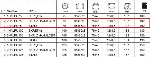 Набір складається з чотирьох коліс, оснащених пластиною. У комплект входить два фіксованих комплекти код 3HALPU75K2 (поз. 3 в таблиці) і два поворотних колеса з кодом гальма 2HALPU75K2 (поз. 2 в таблиці).