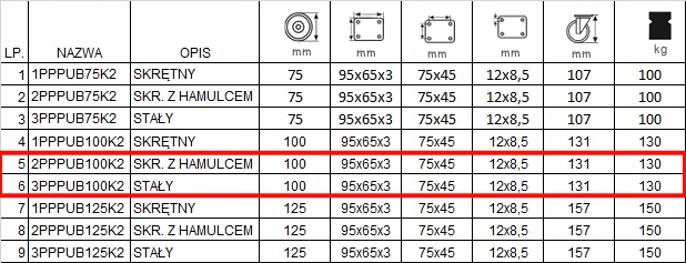 - Виготовлені корпус сталеві аркуші з високою міцністю. Плитка має розміри 95x65x3 мм. Колеса мають діаметр 100 мм, а центри кріплення мають розмір 75 х 45 мм і овальні отвори для кріплення розміром 12 х 8,5 мм. Загальна висота - 131 мм.