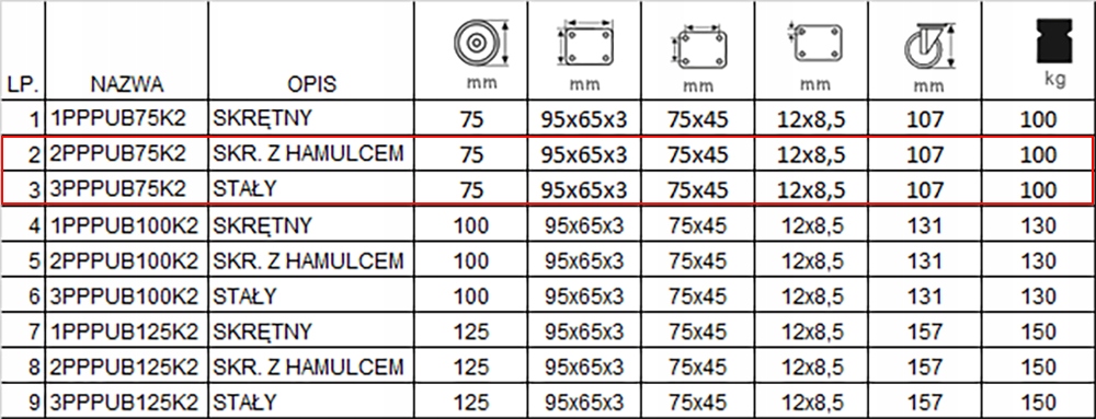 Набір складається з чотирьох коліс, оснащених пластиною для кріплення. У комплект входять два фіксованих комплекти з кодом 3PPPUB75K2 (поз. 3 в таблиці) і два поворотних колеса з гальмом з кодом 2PPPUB75K2 (поз. 2 в таблиці). p>