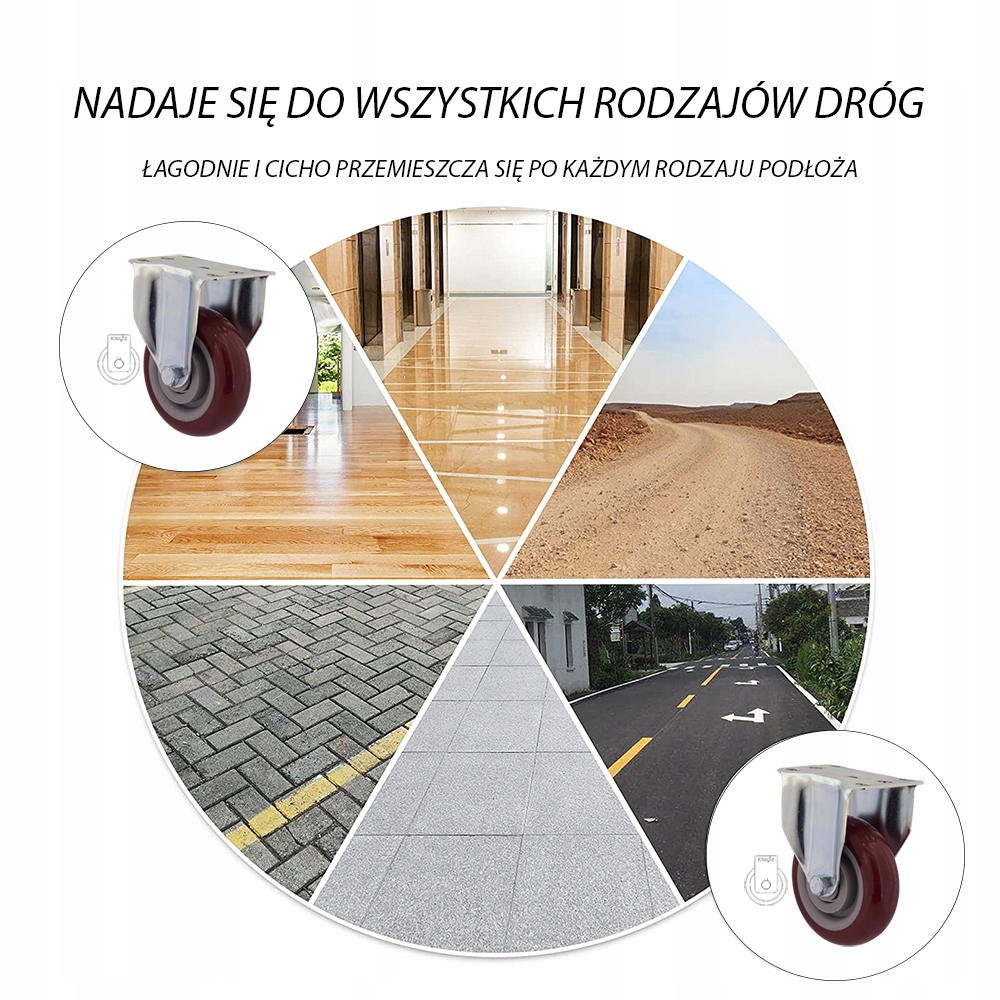 - КОЛЕСО складається з поліпропіленової втулки та поліуретанової шини без слідів, має подвійну кулькову опору. Колеса мають міцність 100 кг на колесо. Вони повільно зношуються, стійкі до пошкоджень, поглинають удари та вібрацію. Вони обертаються на 360 градусів, полегшуючи маневрування меблями або коляскою. Вони плавно обертаються на твердих і гладких поверхнях, як-от бетон, з дуже невеликим тертям.