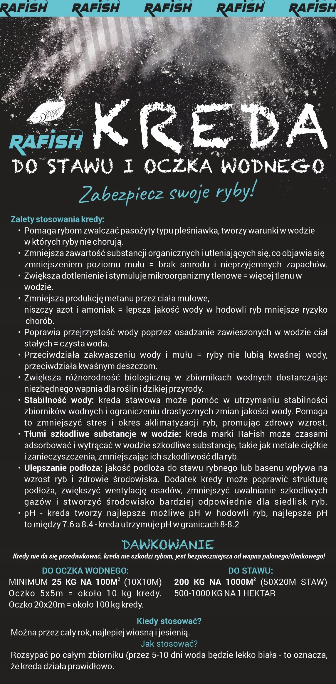крейда бренду RaFish іноді може адсорбувати й осаджувати шкідливі речовини, такі як важкі метали та забруднюючі речовини у воді, зменшуючи їх шкідливість для риб.