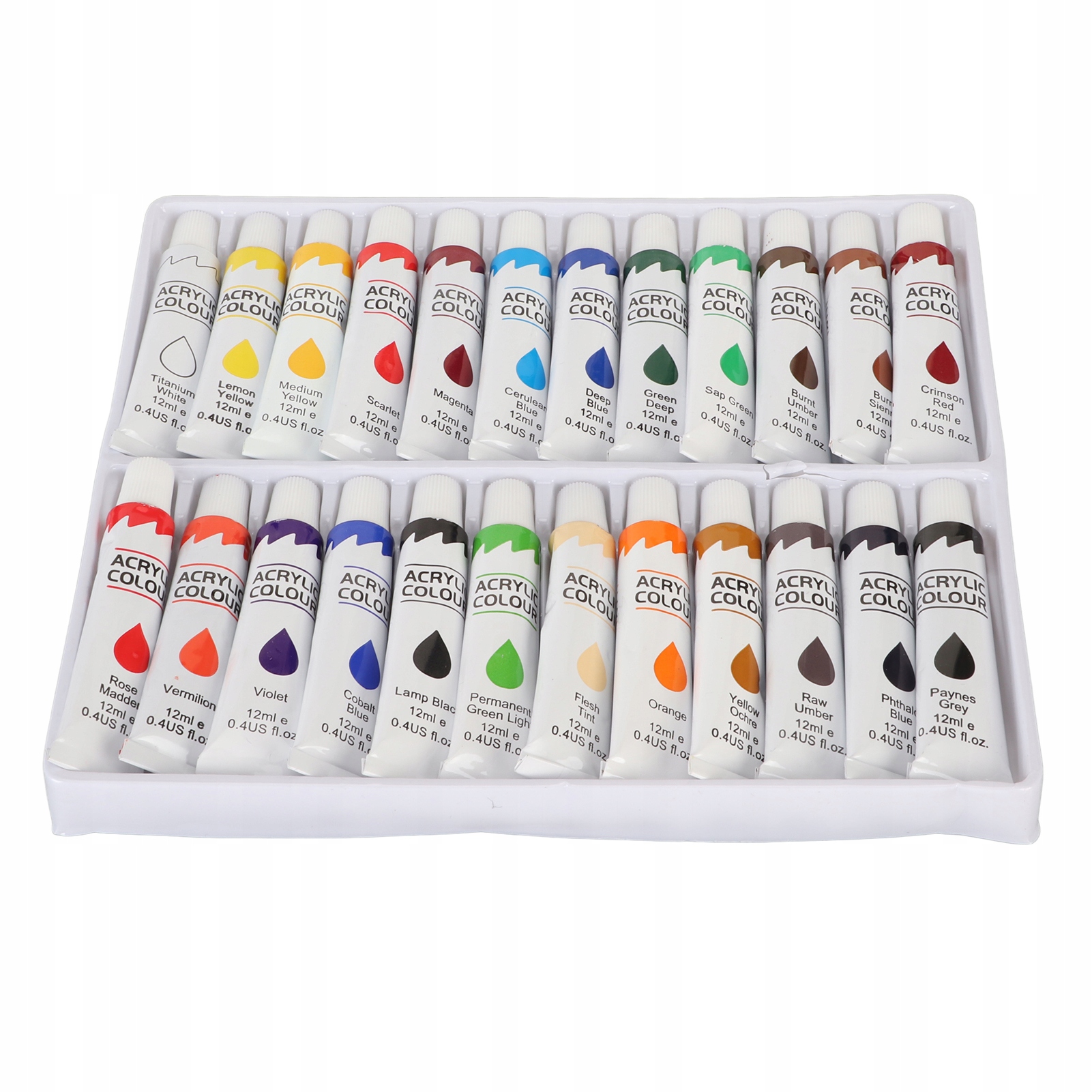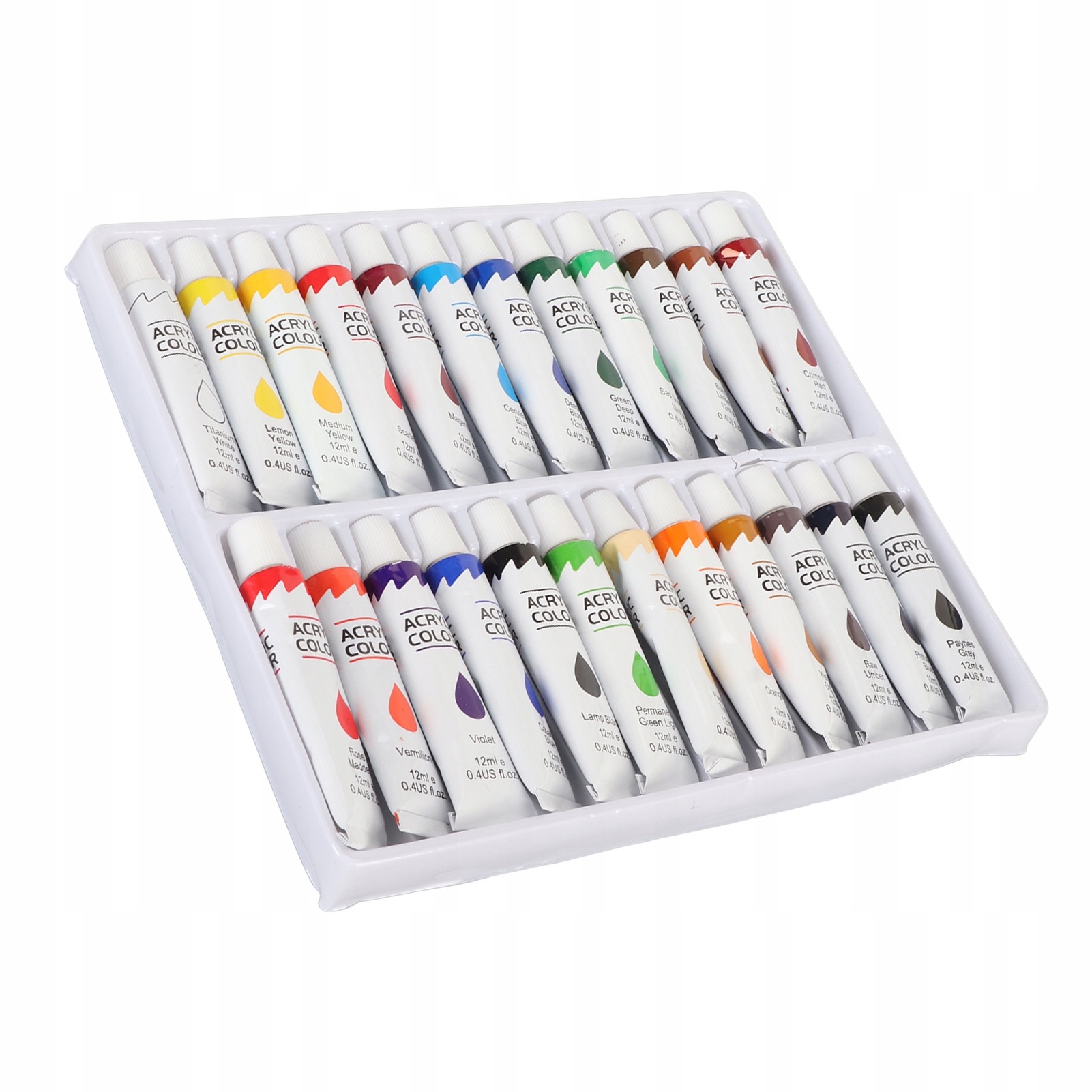 3. 24 кольори: набір акрилових фарб містить 24 кольори, об’єм 12 мл, підходить для початківців і досвідчених художників.