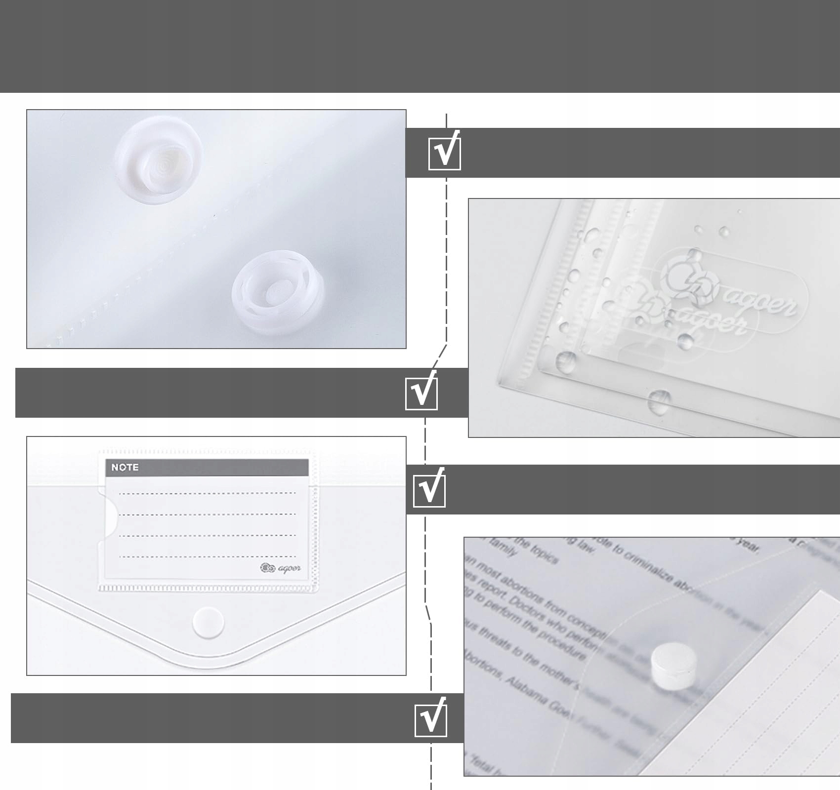А4 -сумка пропонує міцну та водонепроникну перевагу. Виготовлений з високоякісного поліпропілену (pp) його можна легко відкрити та закрити засувкою, ідеально підходить для безпечної передачі.