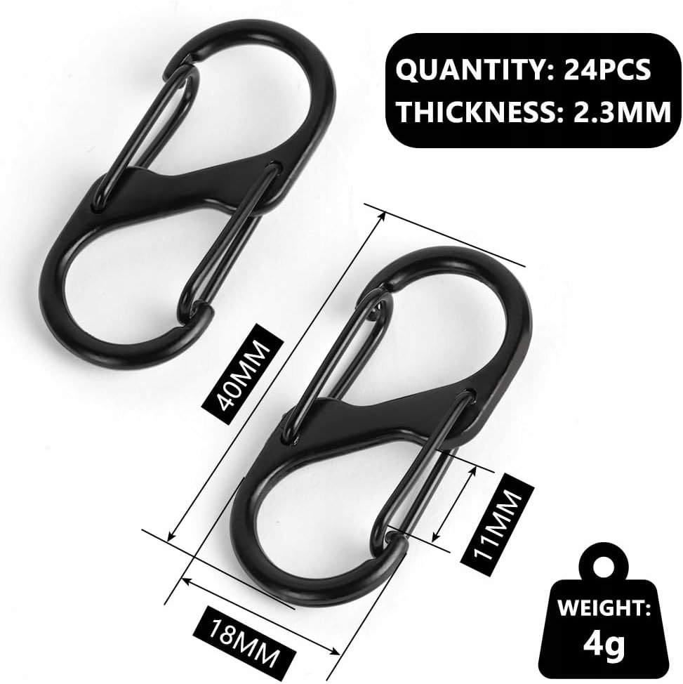 Набір із 24 карабінів S-Hook є незамінним елементом для мандрівників та активних людей, полегшуючи організацію спорядження під час подорожі чи повсякденна діяльність. Вони ідеально підходять для кріплення різних предметів на рюкзак, ремінь або сумку, а також як практичні брелоки, забезпечуючи не тільки безпеку, але й комфорт носіння.