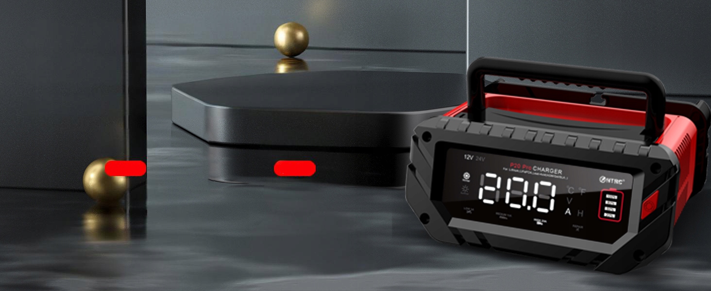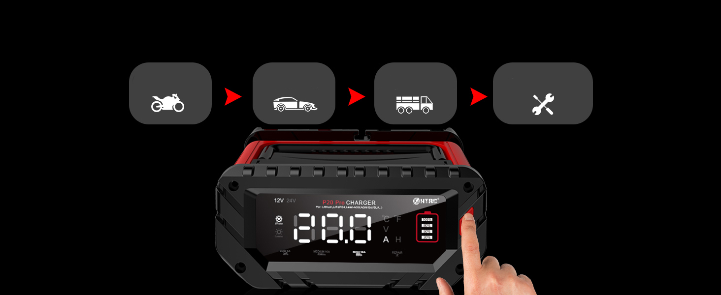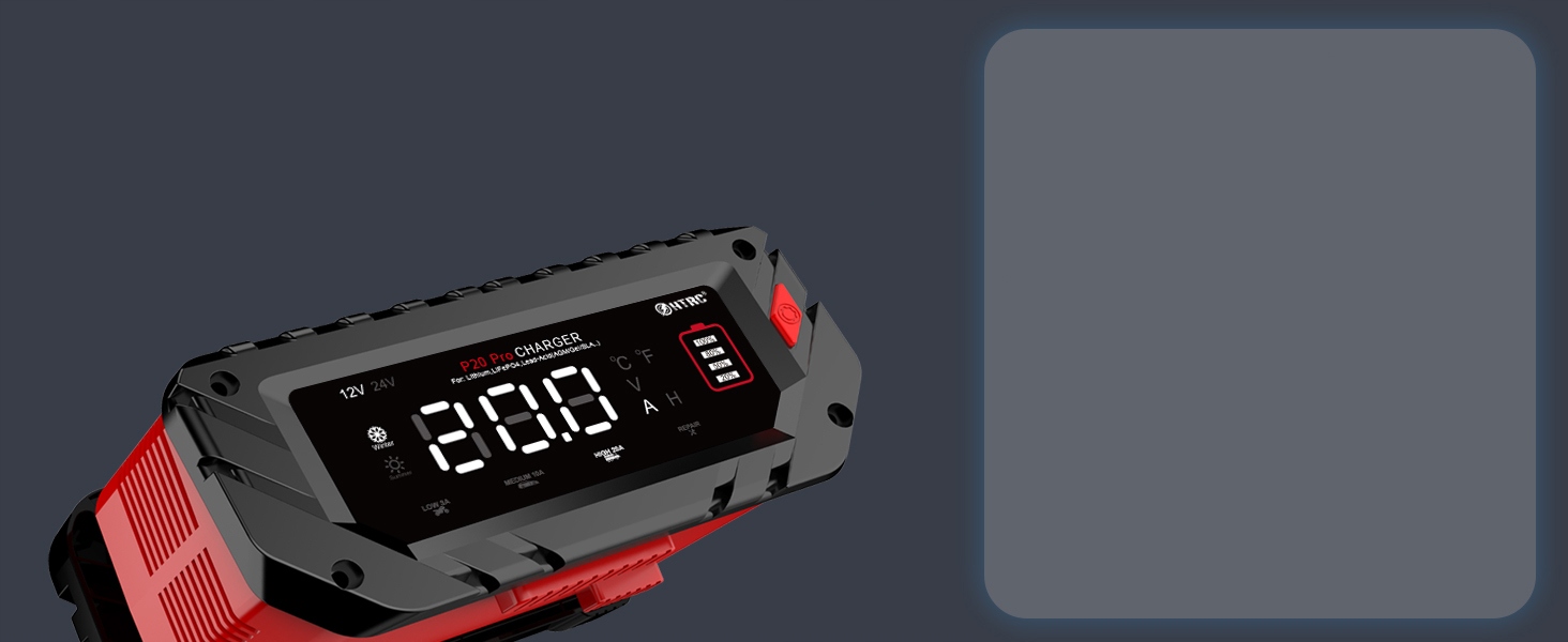 🚤【Запуск однією кнопкою】Зарядний пристрій 12 В/24 В автоматично визначає напругу акумулятора та може перемикатися між 4 режимами заряджання одним натисканням кнопки. На РК-екрані відображається напруга акумулятора, струм заряджання, температура заряджання, рівень заряду акумулятора тощо. Зарядний пристрій автомобільного акумулятора автоматично регулює потужність заряджання відповідно до температури навколишнього середовища.