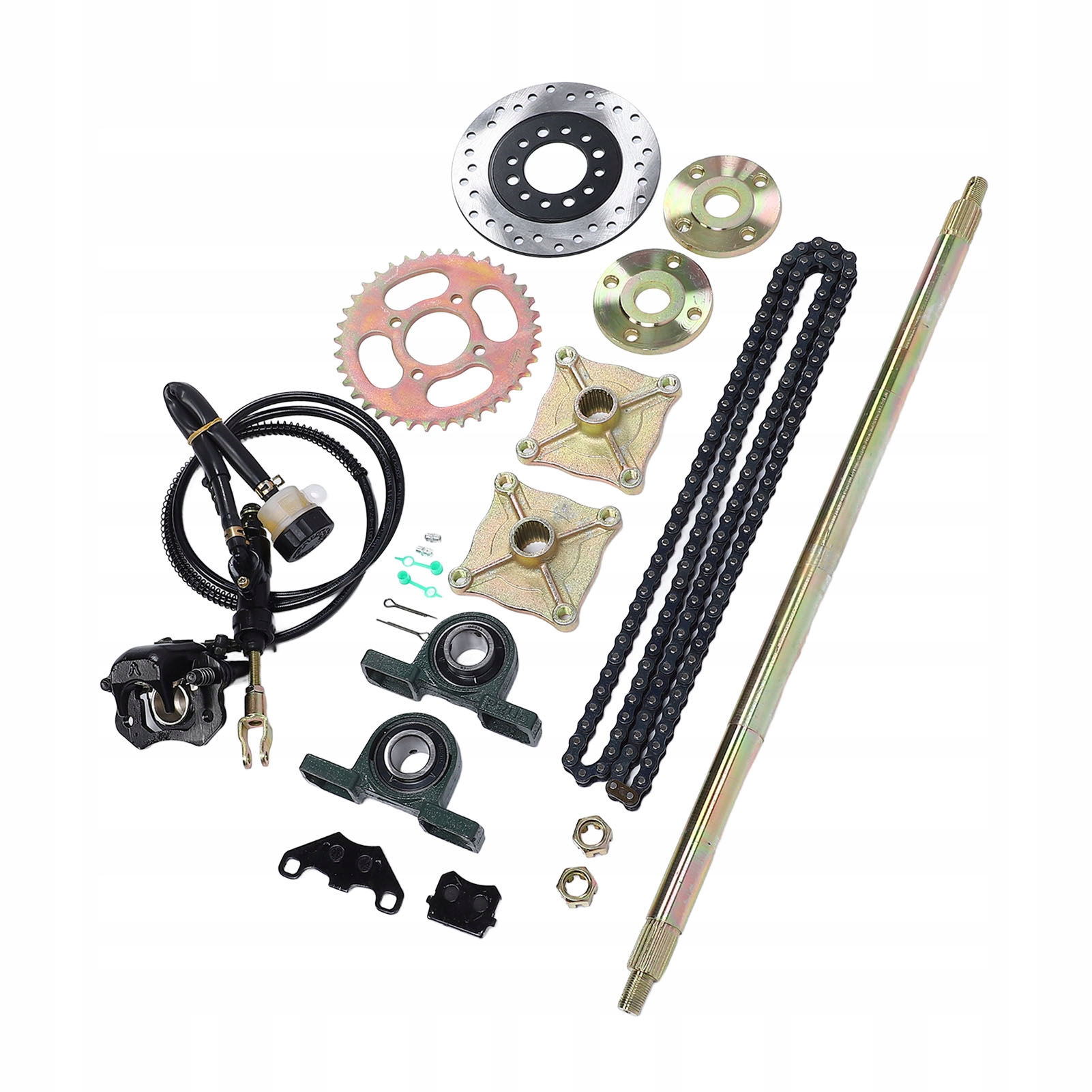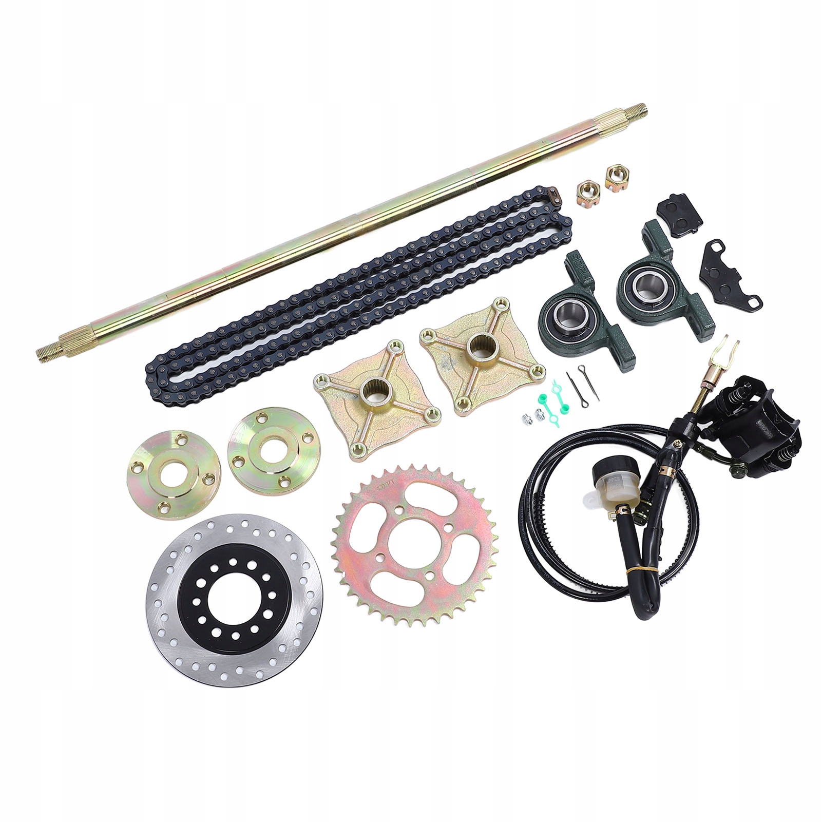 4. Повний комплект: в набір входить задня вісь 65 см, підшипники 205, фланець з 23 зубцями та чотирма отворами, ланцюгова зірочка 428 тип 37, гальмівний диск діаметром 16 см, гніздо зірочки ланцюга, головний гальмівний циліндр, ланцюг, гвинтовий штифт задньої осі.