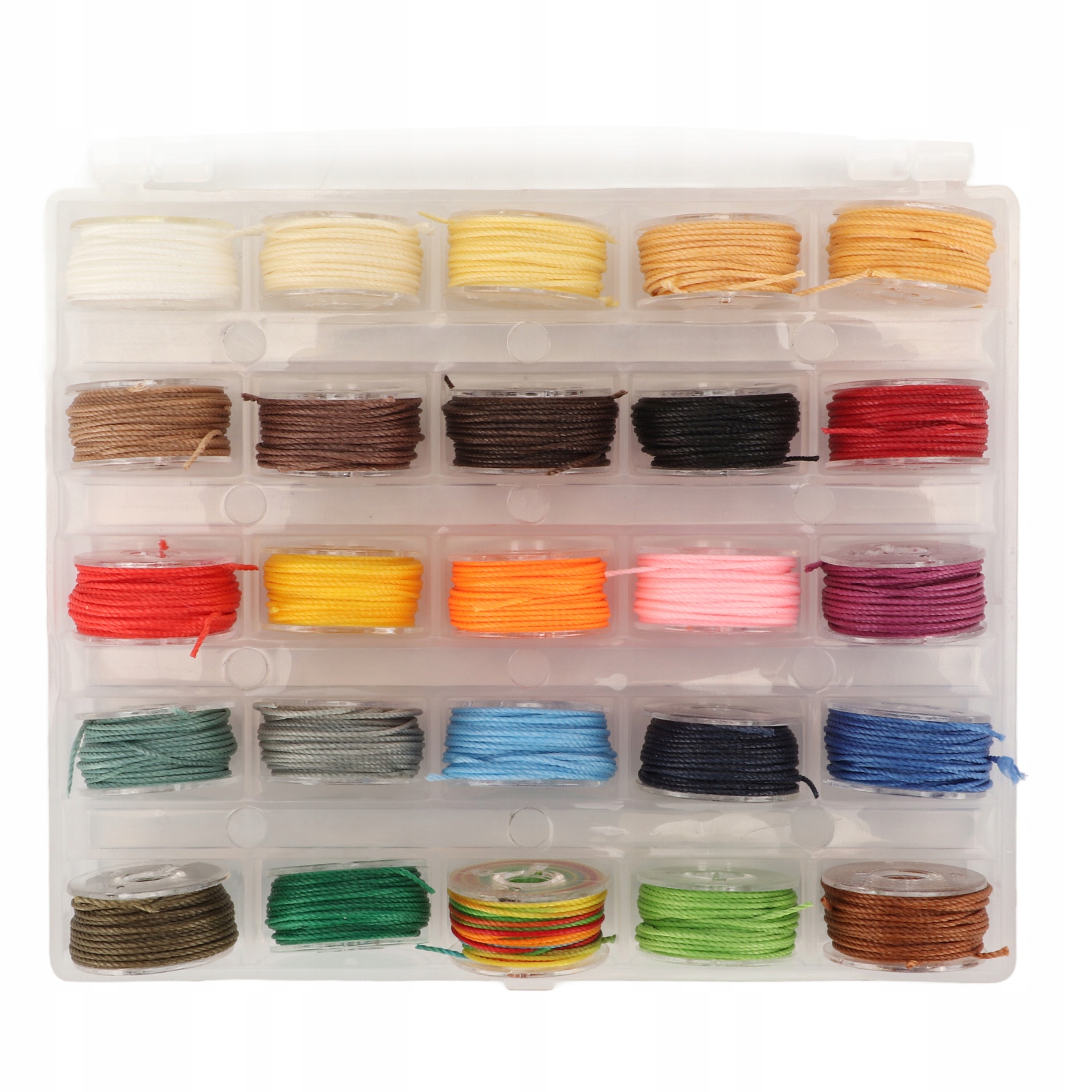 1. 25 кольорів: Вірний кабель містить 25 різних кольорів воскових ниток у різних кольорах для задоволення різних потреб. Універсальний: воскова нитка підходить для шкіряних виробів, намистин та палітурки для книг і ідеально підходить для в'язання, швейної машини, в'язання гачком та інших домашніх прикрас. Відповідні люди: нитка ідеально виготовлена і ідеально підходить для початківців, професіоналів чи саморобних робіт. Легке зберігання: воскова струна налаштована з котушками, щоб легко організувати нитку і підтримувати її тонкою, з прозорим пластиковим корпусом, який допомагає ефективно працювати з ними вишивки. Поліестерний матеріал: восковий поліестерний кабель виготовлений з поліефірного матеріалу, який є гнучким, м'яким і міцним, стійким до зносу і може бути використаний протягом тривалого часу.