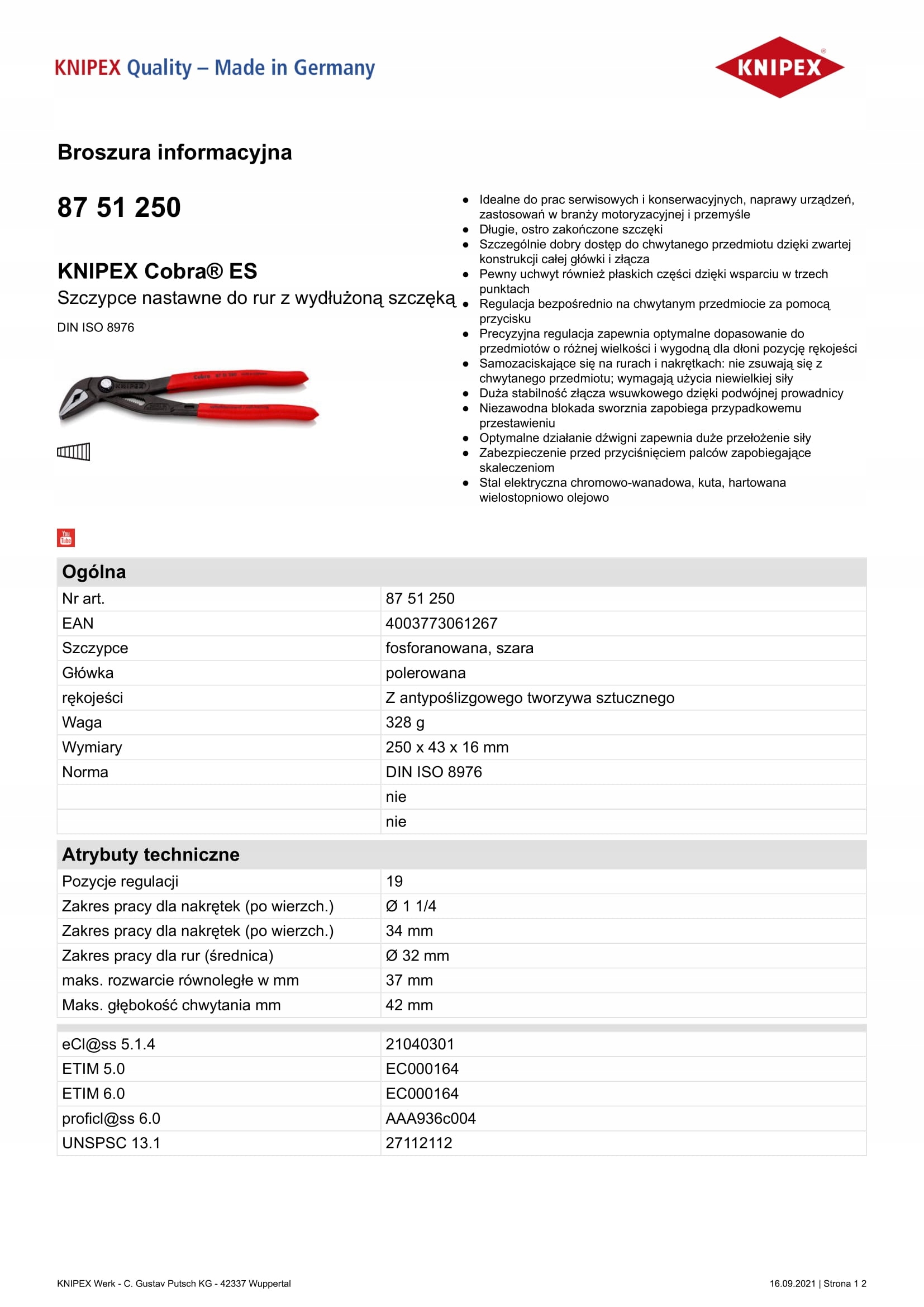 250 мм регульовані плоскогубці витягнуті щелепи Cobra 87 51 250 Knipex