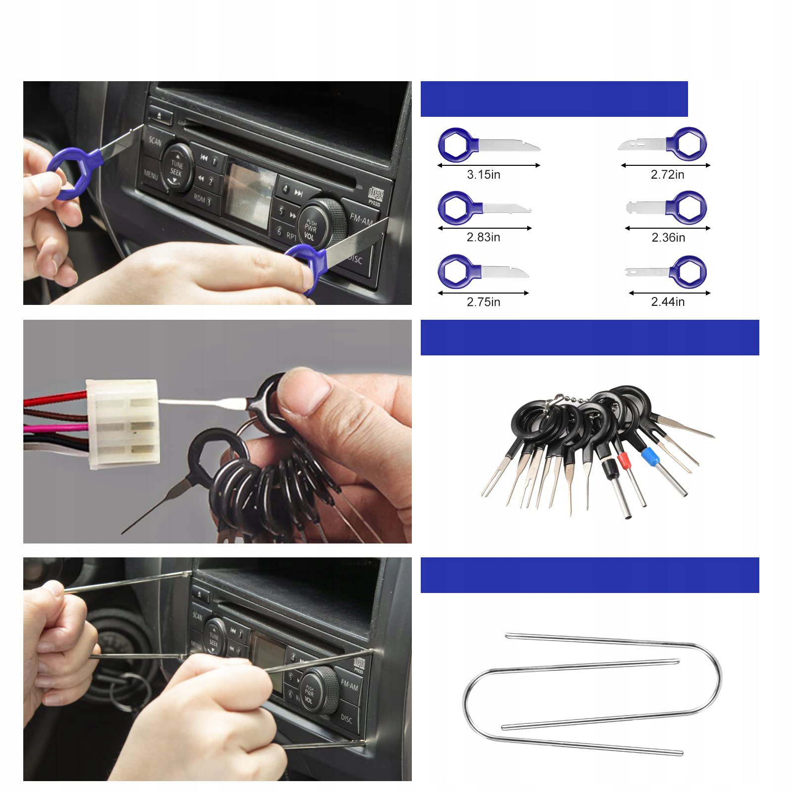 - ???Універсальний автомобільний інструмент для виймання ключа з аудіосистеми з 8 частин. Радіоприймачі Set?Removal Tools прості у використанні та економлять багато часу та грошей, дозволяючи зробити це самостійно. Просто вставте ключ у заводські отвори з правого та лівого боку та вийміть магнітолу. підходить для всіх стереосистем.
