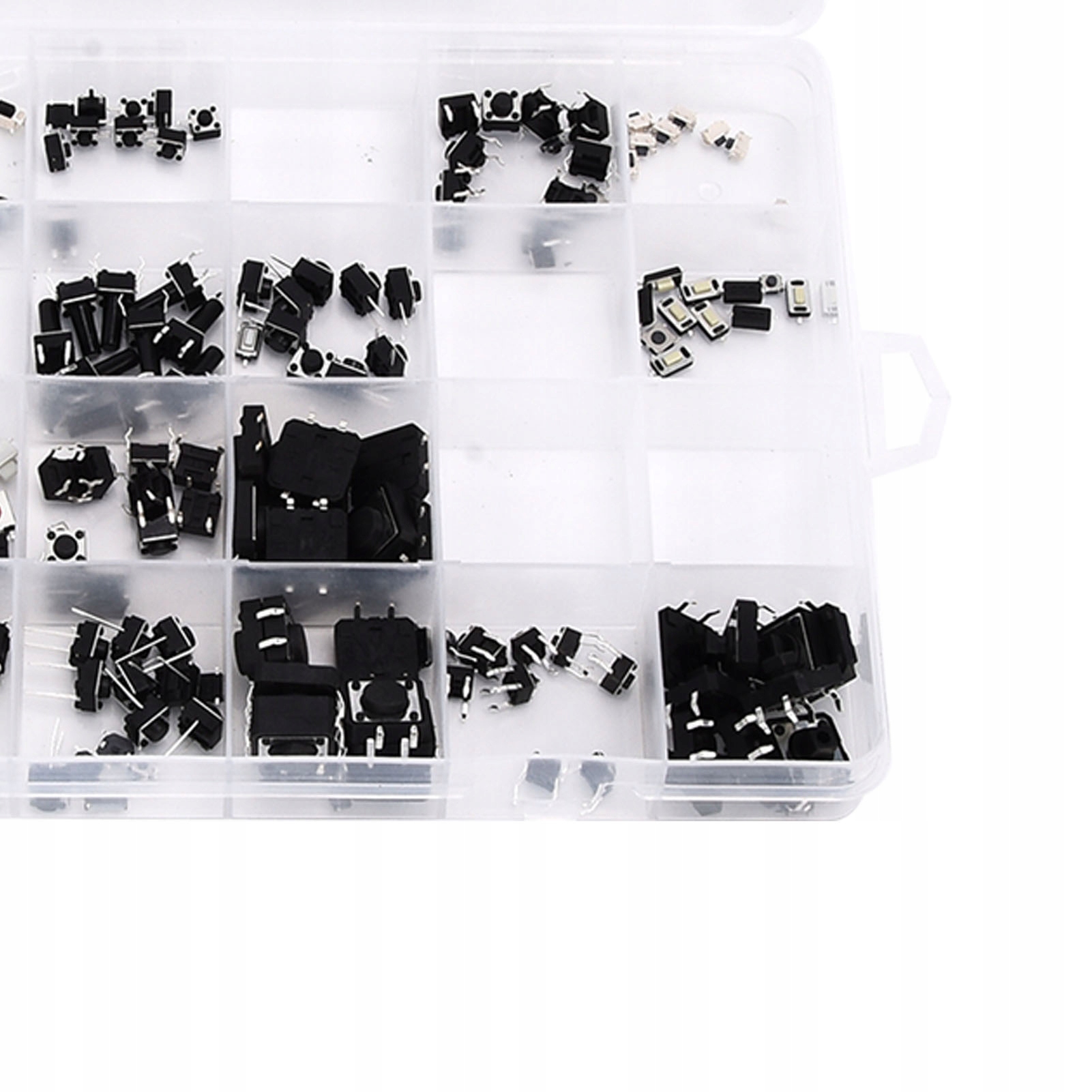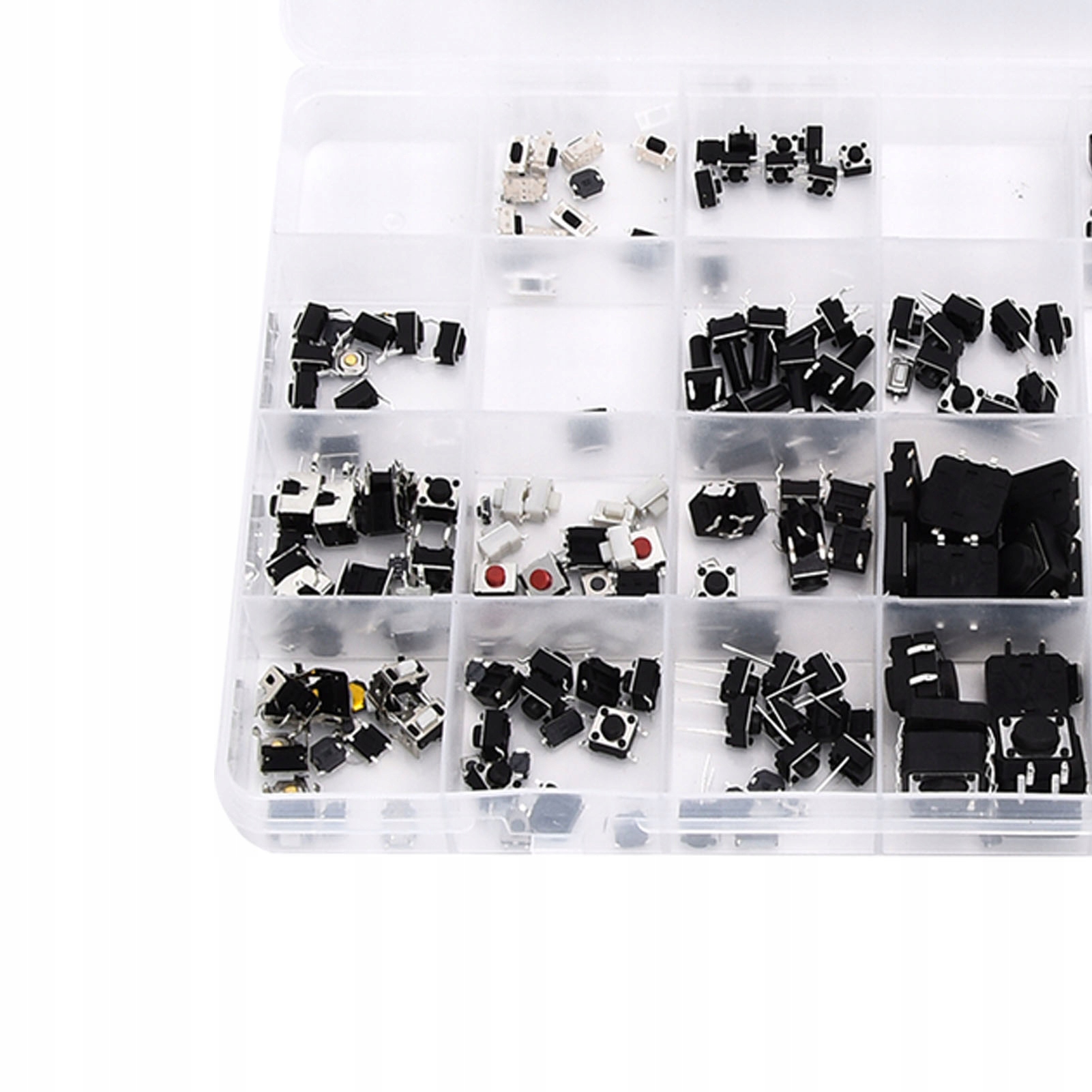 1, 25 видів перемикачів, по 10 одиниць кожного типу, загалом 250 одиниць наборів комбінацій тактових перемикачів. 2. Перемикач відкривається при натисканні кнопки перемикача, а коли тиск скидається, перемикач закривається. 3, внутрішня структура відкривається та закривається пружиною, яка проста в установці та проста в експлуатації. 4. Тактовий перемикач виготовлений із пластику, легкий, водонепроникний і міцний. 5, підходить для телевізорів, аудіообладнання, комп’ютерів та інших електронних виробів і побутової техніки тощо.