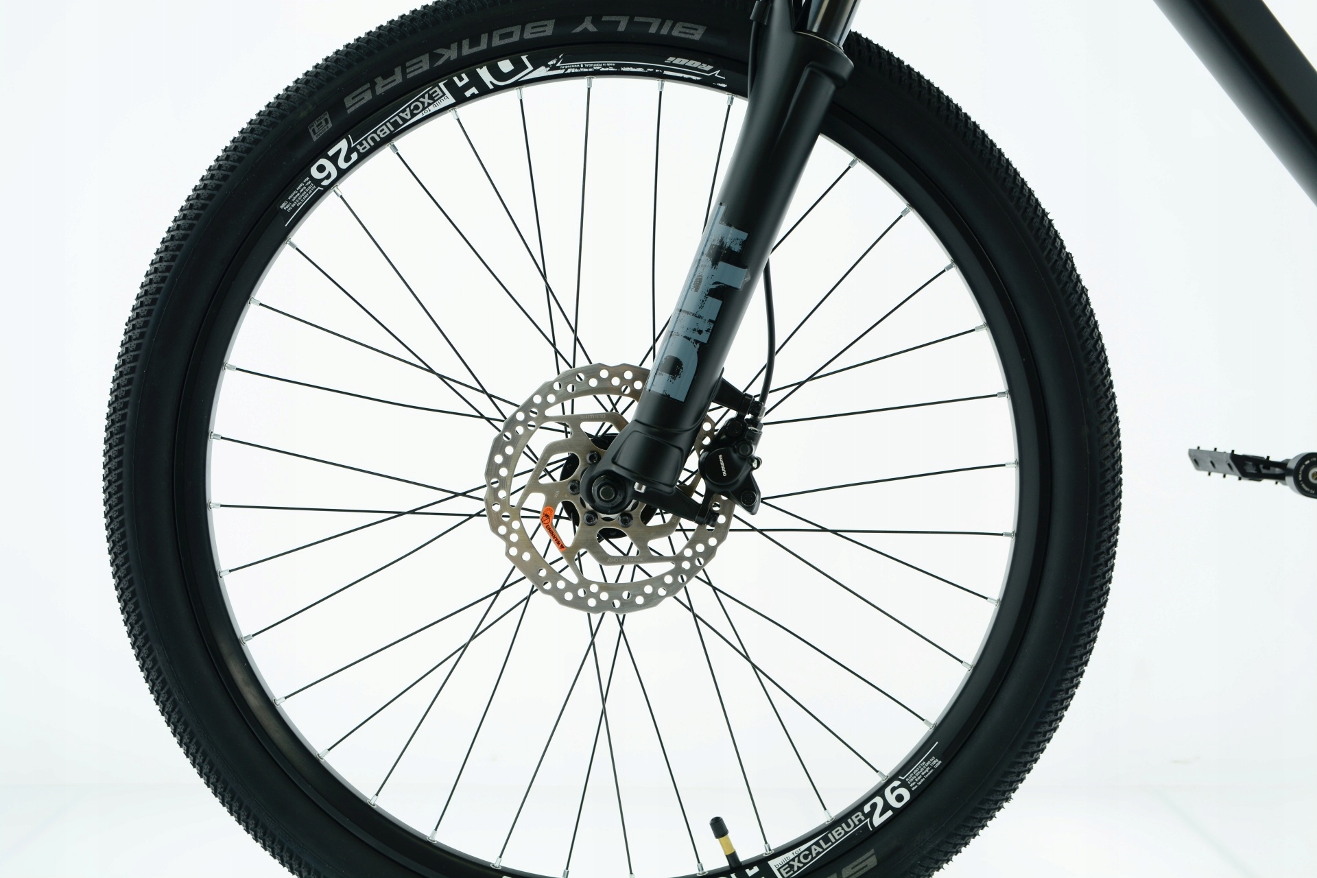 Велосипед оснащено гідравлічними дисковими гальмами Shimano, легендарною брудовою вилкою RST DIRT із ходом 100 мм і конічною трубою. Великою перевагою є суцільні колеса з дисками RODI EXCALIBUR DH і втулками з картриджними підшипниками (заднявтулка встановлена на боти).