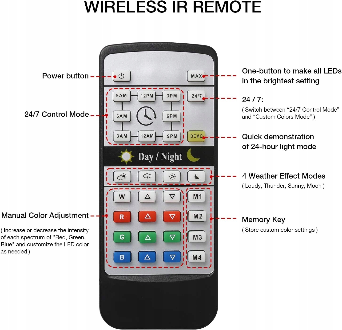 - ЕКОЛОГІЧНЕ ДЕННЕ ОСВІТЛЕННЯ:Освітлення для акваріумних риб оснащено 24-годинним автоматичним режимом сонячного світла та 4 режимами погодних ефектів (хмарно, гроза, сонце, місяць). Ви також можете вибрати спеціальний колірний режим, щоб створити освітлювальне рішення відповідно до ваших водних рослин.
